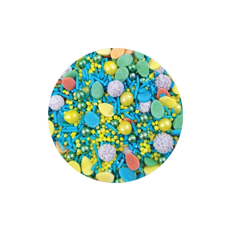 Posypka mix Wielkanocny to fantastyczna gotowa kompozycja w ekonomicznym, dużym opakowaniu. W skład starannie wyselekcjonowanej kompozycji wchodzą: żółte, niebieskie, zielone, czerwone i pomarańczowe jajeczka, zielone metaliczne perełki, duże nieregularne fioletowe kule, podłużne błękitne patyczki i drobne żółte maczki. Całość zapewnia piękną, wielkanocną kolorystykę kojarzącą się z wiosną i pisankami. Niezwykłe połączenie różnych kształtów: konfetti w kształcie jajeczek, dużych kul z lśniącymi perełkami, drobnymi maczkami i niebieskimi patyczkami tworzy wspaniały, przebogaty efekt. Pozwala ciekawie udekorować: torty, muffinki, ciasta desery, cake pops, ciasteczka, pierniczki i wszelkie rodzaju wypieki. Możemy stworzyć zachwycające dekoracje, doskonałe do ozdabiania wielkanocnych wypieków i słodkości.