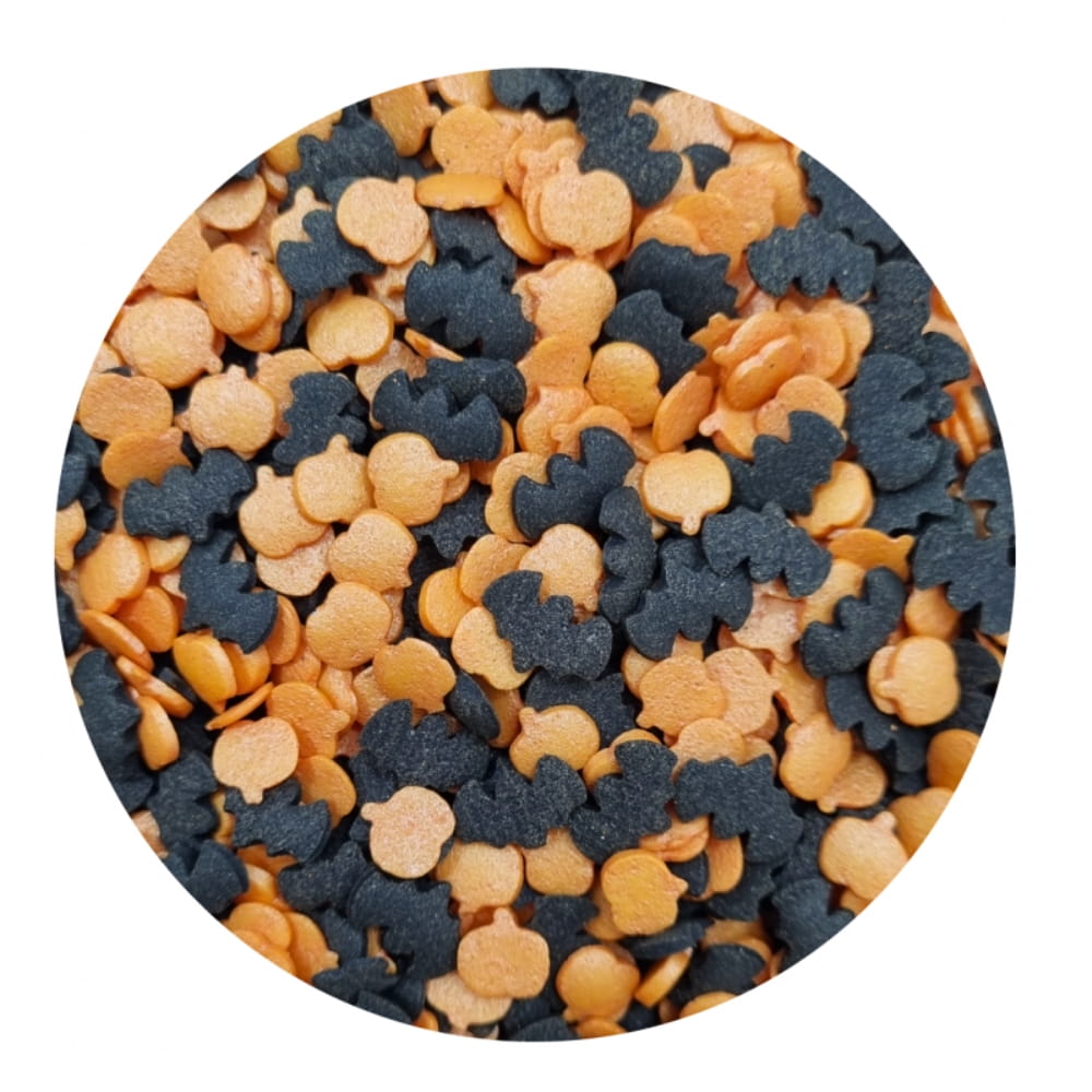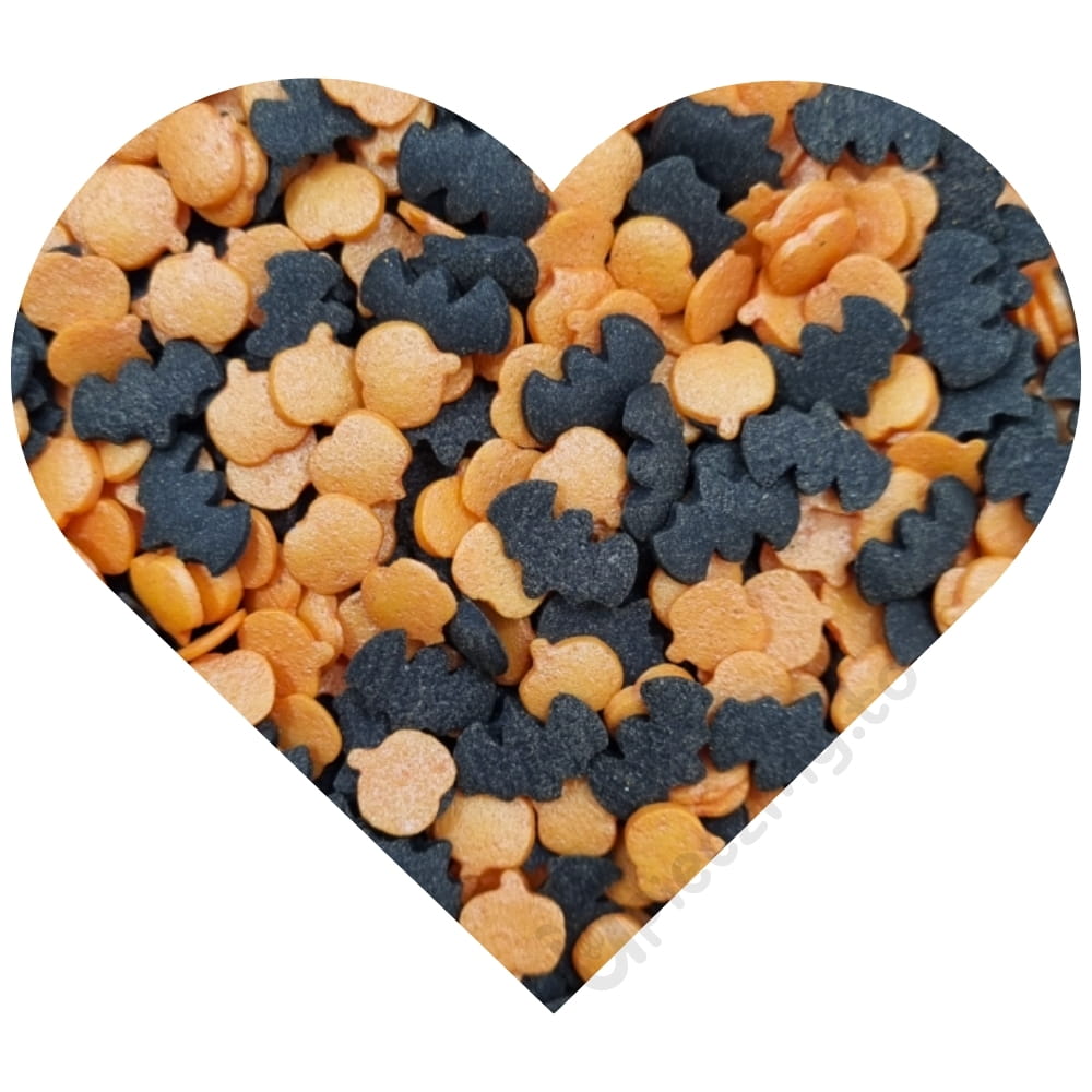 Posypka cukrowa to drobne konfetti w kształcie pomarańczowych dyni i czarnych nietoperzy. Konfetti mają około 8 mm. Pozwalają ciekawie udekorować: torty, muffinki, ciasta desery, cake pops, ciasteczka, pierniczki i wszelkie rodzaju wypieki. Jadalna posypka na tort pozwala stworzyć zachwycające dekoracje. Doskonała do ozdabiania wypieków i słodkości związanych z Halloween, upiorami i jesienią!