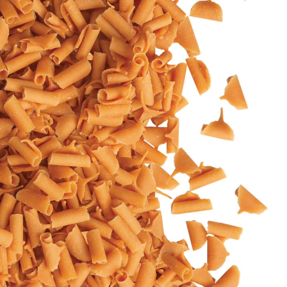 Posypka czekoladowa w postaci gotowych do użycia wiórków o smaku karmelu i pysznej białej czekolady. Standardowa wielkość: 9 × 5 mm. Te lekkie i wydajne wiórki są bardzo wszechstronnym elementem cukierniczych dekoracji ciast, tortów i deserów. W połączeniu z musem, kremem czy ganaszem pozwalają na uzyskanie ciekawej tekstury. Połączenie barwy i aromatu chętnie wykorzystywane do dekoracji tematycznych związanych z Dniem Matki, Dniem Ojca oraz tortami dla dzieci.