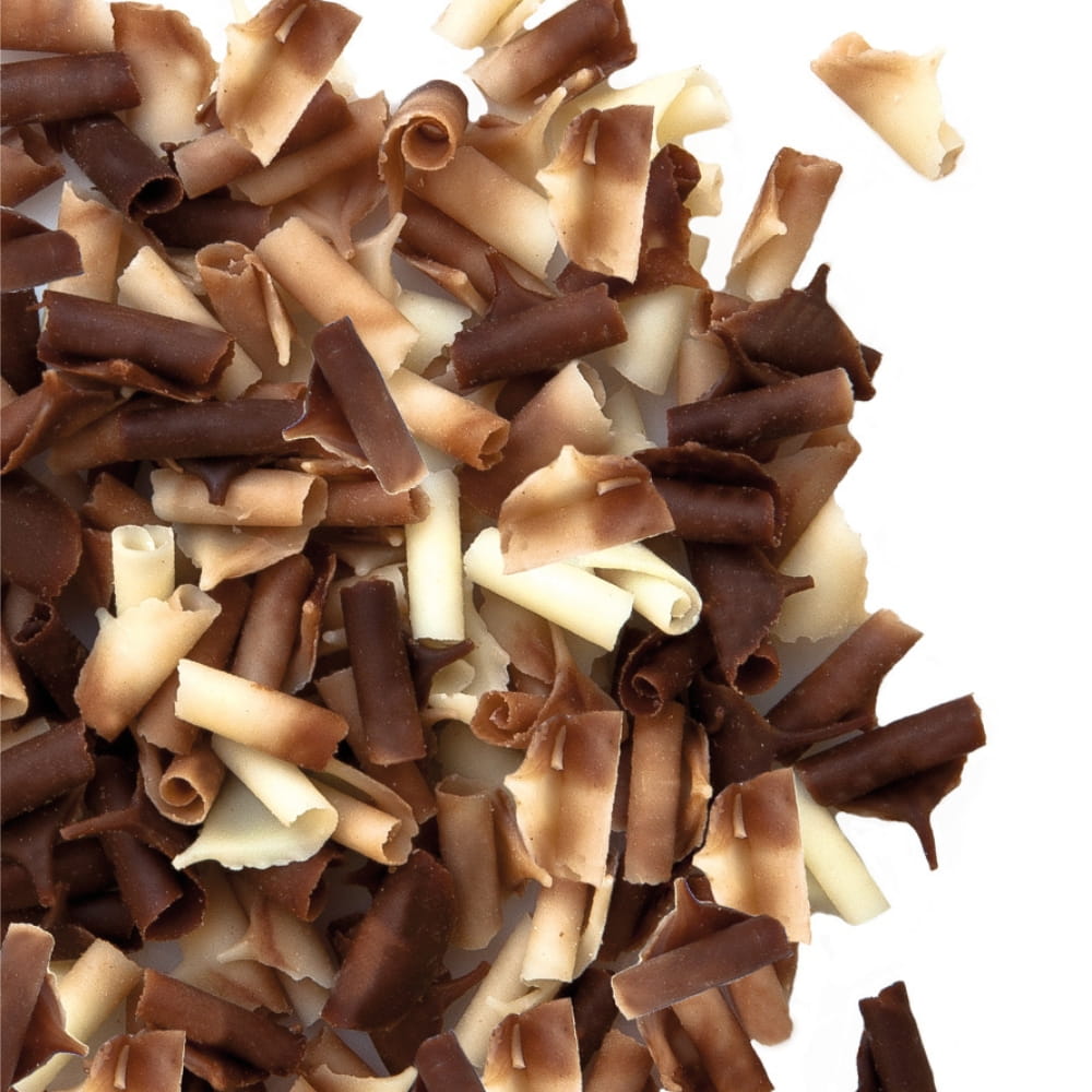 Posypka czekoladowa w postaci gotowych do użycia wiórków z pysznej białej oraz deserowej czekolady. Standardowa wielkość: 9 × 5 mm. Te lekkie i wydajne wiórki są bardzo wszechstronnym elementem cukierniczych dekoracji ciast, tortów i deserów. W połączeniu z musem, kremem czy ganaszem pozwalają na uzyskanie ciekawej tekstury. Połączenie barwy i aromatu chętnie wykorzystywane do dekoracji tematycznych związanych z Dniem Matki, Dniem Ojca oraz tortami dla dzieci.