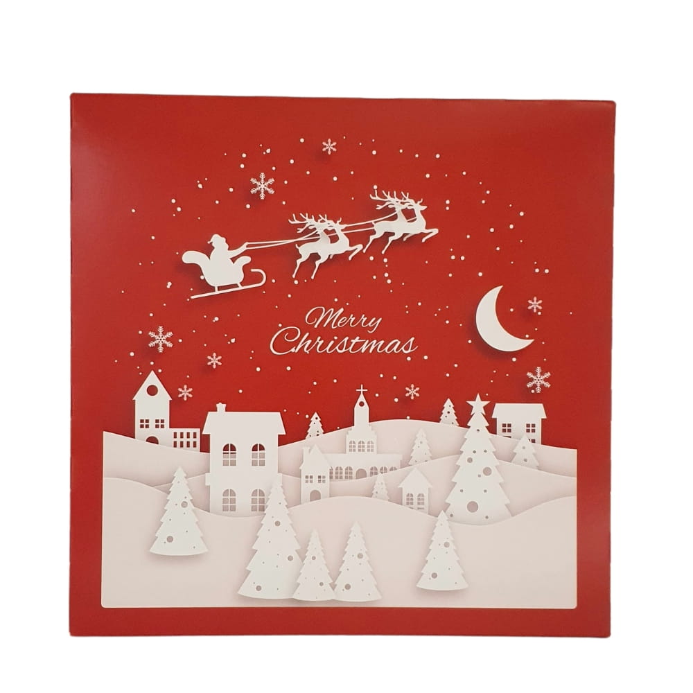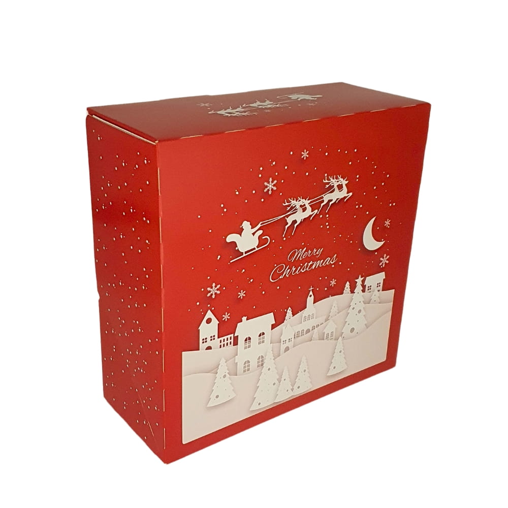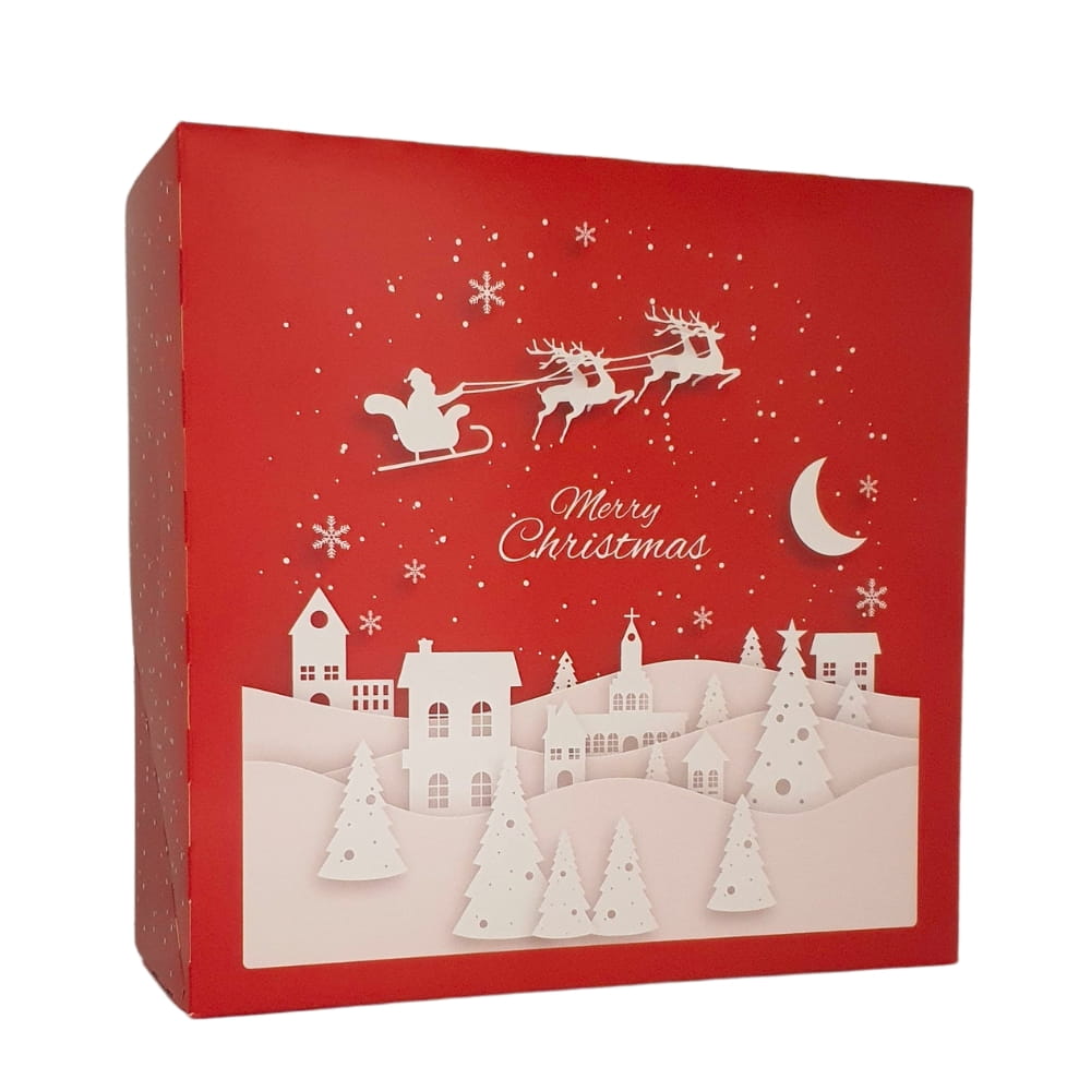 Wyjątkowe czerwone pudełko na ciasto z nastrojowym kolorowym nadrukiem na Święta Bożego Narodzenia. Uroczy obrazek stworzony za pomocą prostych białych form przywodzących na myśl wycinanki z papieru. Nastrojowa scenka z uśpionym miasteczkiem i Mikołajem sunącym po nocnym niebie w saniach zaprzężonych w renifery. Całość uzupełnia delikatny napis kursywą: Merry Christmas. Bardziej świątecznie już się nie da:) Elegancki i nastrojowy wzór: idealny, żeby podkreślić wyjątkowość wypieków w tym magicznym czasie.