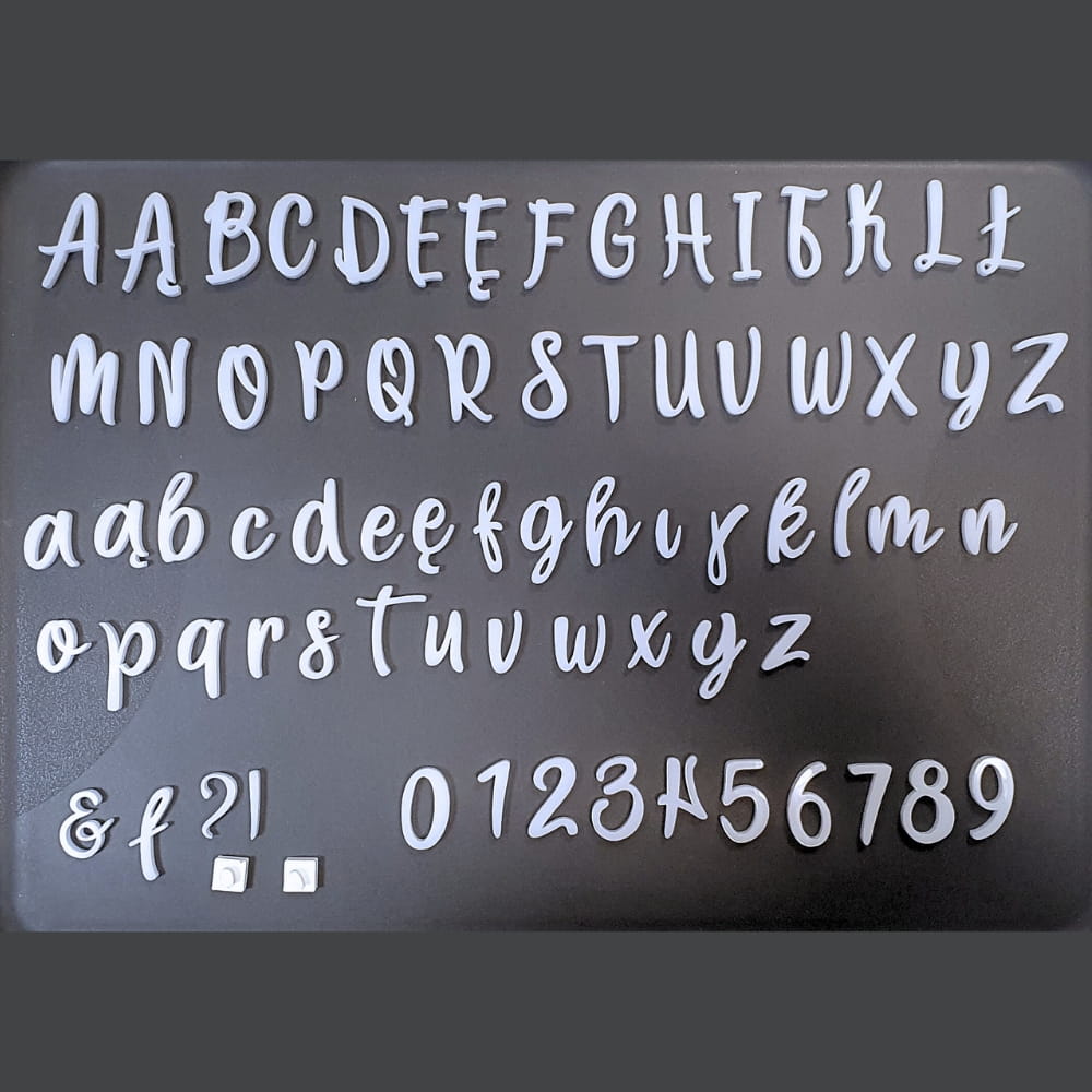 - Zawartość zestawu: małe, duże litery, cyfry, polskie czcionki, znaki specjalne: & ! ?