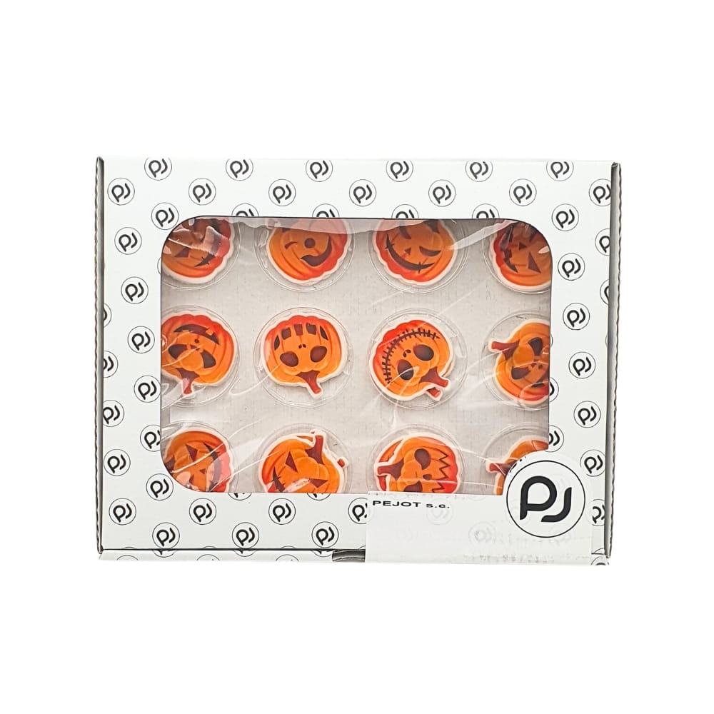 Figurki cukrowe na Halloween to gotowe do użycia dekoracje z masy cukrowej. W opakowaniu 24 okrągłe, nadrukowane krążki przedstawiające różne wersje upiornych halloweenowych dyni. Dekoracja jest w 100% jadalna, zawiera tylko bezpieczne barwniki. Idealna do ozdobienia halloweenowego tortu, deseru, wypieków, monoporcji, babeczek, muffinek, ciast i wszelkich strasznych słodkości. W opakowaniu mix różnych wzorów dyni, łącznie 24 sztuki.