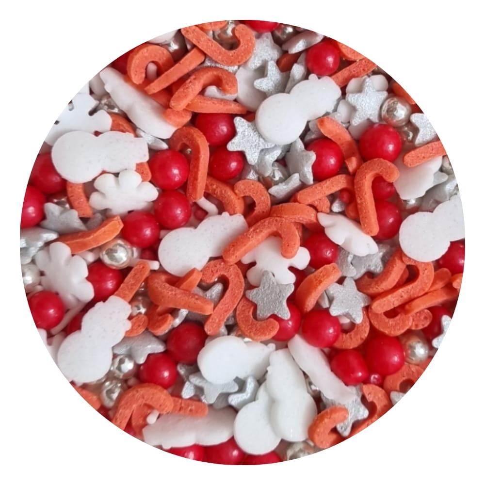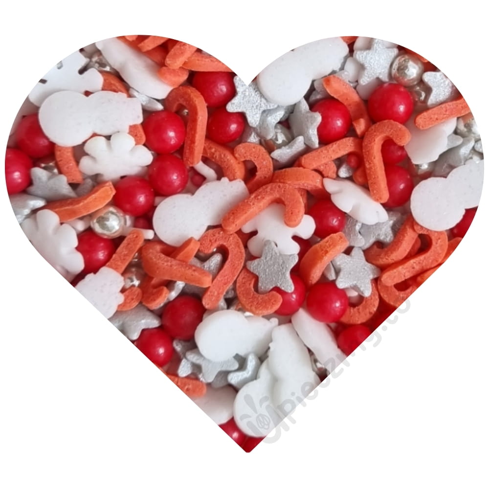 Posypka Czerwony Mix świąteczny to fantastyczna gotowa kompozycja w poręcznym, zamykanym pojemniczku. W skład starannie wyselekcjonowanej kompozycji wchodzą: białe bałwanki i śnieżynki, srebrne gwiazdki, czerwone laski, intensywnie czerwone perełki i srebrne perełki. Całość zapewnia piękną, świąteczną kolorystykę kojarzącą się z choinką i prezentami. Niezwykłe połączenie różnych kształtów: konfetti w kształcie bałwanków, gwiazdek i śnieżynek z lśniącymi perełkami tworzy wspaniały, przebogaty efekt. Pozwala ciekawie udekorować: torty, muffinki, ciasta desery, cake pops, ciasteczka, pierniczki i wszelkie rodzaju wypieki. Możemy stworzyć zachwycające dekoracje, doskonałe do ozdabiania świątecznych wypieków i wszelkich słodkości związanych z nastrojem Bożego Narodzenia.