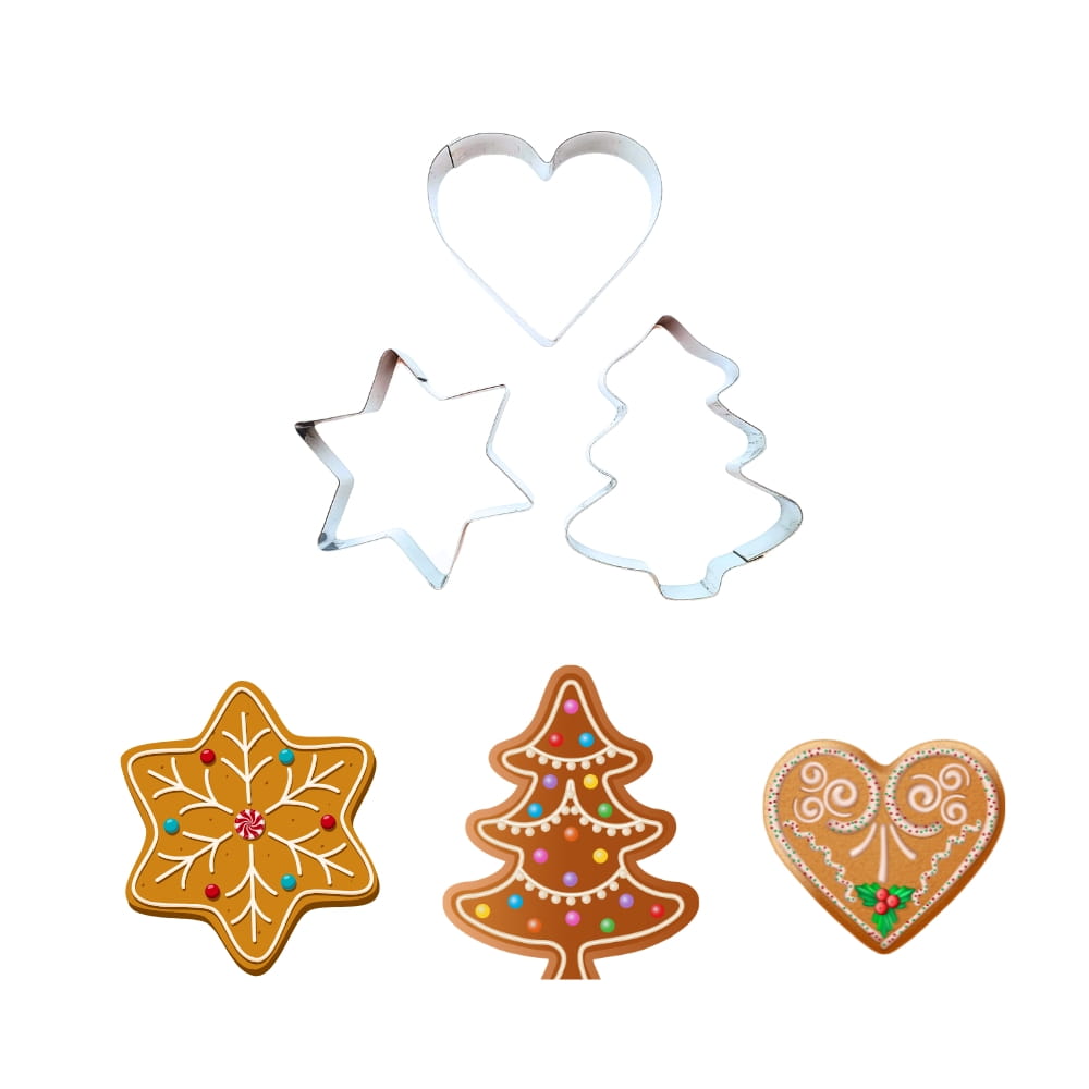 Świąteczne wykrojniki do wycinania i formowania pierników i ciastek. Trzy metalowe wykrojniki przedstawiają: serce, choinkę i gwiazdę. Produkt świetnej jakości, utrzymujący swoją formę. Wykonane z higienicznej i łatwej do utrzymania w czystości stali nierdzewnej. Posiadają atest do żywności. Są naprawdę ostre: poradzą sobie nawet ze schłodzona masą cukrową. Zestaw pozwala uformować ciasteczka, ozdoby z masy cukrowej, ciastoliny, marcepanu, czekoladki lub pierniczki. Można też tworzyć kolorowe dekoracje z masy cukrowej! Stworzone w ten sposób bożonarodzeniowe dekoracje są idealne do malowania, pokrywania, ozdabiania i lukrowania.