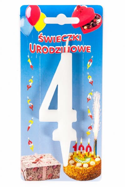Świeczka urodzinowa: wyjątkowa, biała świeczka w kształcie cyfry cztery. Posiada odpowiednio ukształtowaną nóżkę do wbicia w tort. Stabilnie stoi. Świeczka zapakowana pojedynczo, w elegancki blister. Opakowanie zawiera 1 świeczkę. W naszej ofercie posiadamy świeczki urodzinowe cyfry różnych kształtów i kolorów.