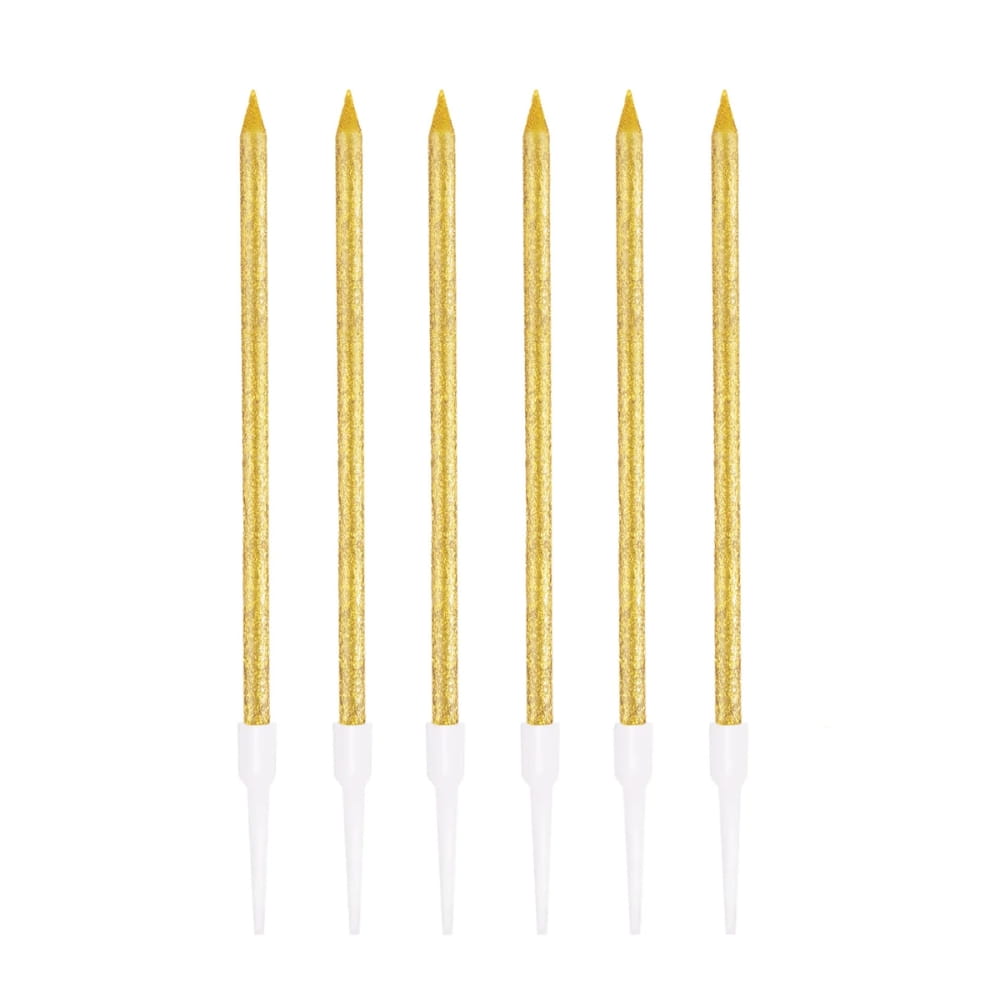 Świeczki urodzinowe o wspaniałym brokatowym, złotym kolorze, który mieni się niezwykłym blaskiem. W opakowaniu 6 zjawiskowych świeczek z imprezowej kolekcji urodzinowej. Komplet prostych świeczek w brokatowo-złotym kolorze. Świeczki mienią się blaskiem i będą stanowić idealną dekorację tortów lub torcików urodzinowych, bento cakes, deserów, zestawów lodowych lub innych słodkości. W eleganckim blisterze: 6 złotych świeczek wraz z podstawkami.