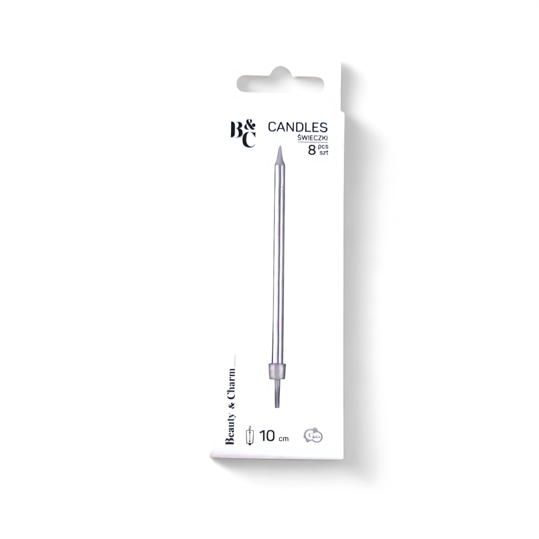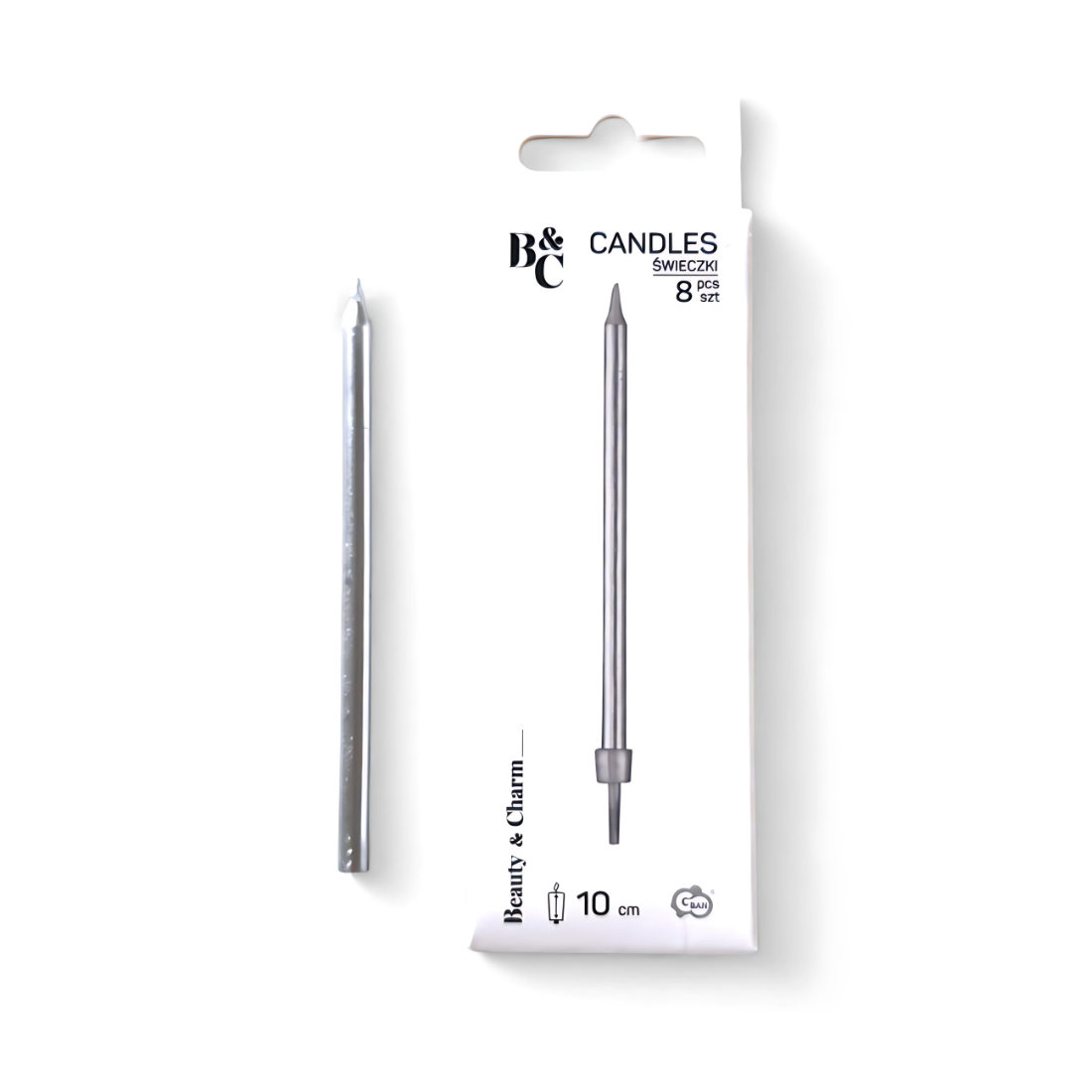 Świeczki urodzinowe o wspaniałym metalicznym, srebrnym kolorze, który mieni się niezwykłym blaskiem. W opakowaniu 8 zjawiskowych świeczek z imprezowej linii urodzinowej. Komplet prostych świeczek w srebrnym, prawdziwie metalicznym kolorze. Świeczki lśnią metalicznym blaskiem i będą stanowić idealną dekorację tortów lub torcików urodzinowych, bento cakes, deserów, zestawów lodowych lub innych słodkości. W eleganckim blisterze: 8 srebrnych świeczek wraz z podstawkami.
