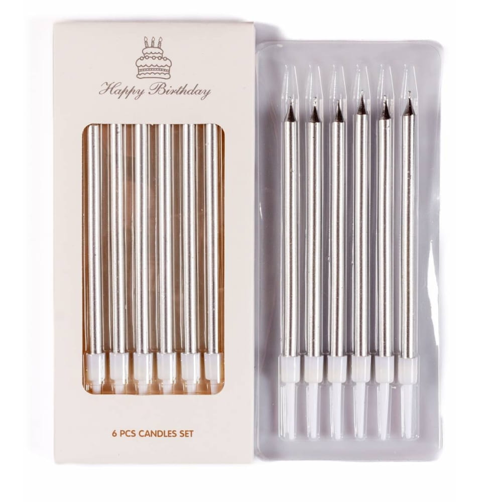 Świeczki urodzinowe o wspaniałym metalicznym, srebrnym kolorze, który mieni się niezwykłym blaskiem. W opakowaniu 6 zjawiskowych świeczek z ekskluzywnej linii urodzinowej. Komplet prostych świeczek w srebrnym, prawdziwie metalicznym kolorze. Świeczki lśnią metalicznym blaskiem i będą stanowić idealną dekorację tortów lub torcików urodzinowych, bento cakes, deserów, zestawów lodowych lub innych słodkości. W eleganckim papierowym opakowaniu: 6 srebrnych świeczek wraz z podstawkami.