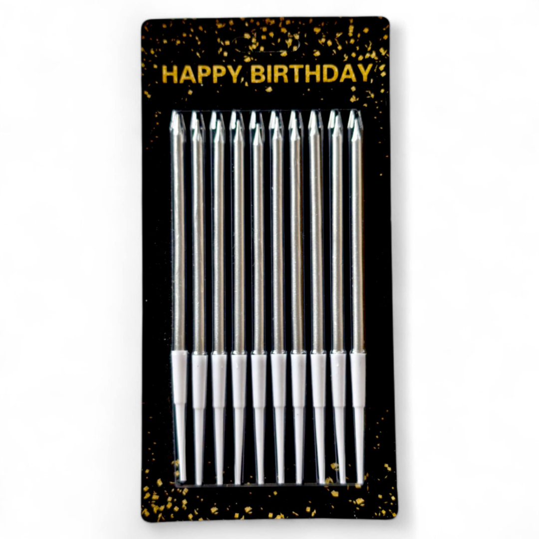 Świeczki urodzinowe o wspaniałym metalicznym, srebrnym kolorze, który mieni się niezwykłym blaskiem. W opakowaniu 10 zjawiskowych świeczek z ekskluzywnej linii urodzinowej. Komplet prostych świeczek w srebrnym, prawdziwie metalicznym kolorze. Świeczki lśnią metalicznym blaskiem i będą stanowić idealną dekorację tortów urodzinowych, deserów, zestawów lodowych lub innych słodkości. W eleganckim blistrze: 10 srebrnych świeczek wraz z podstawkami.