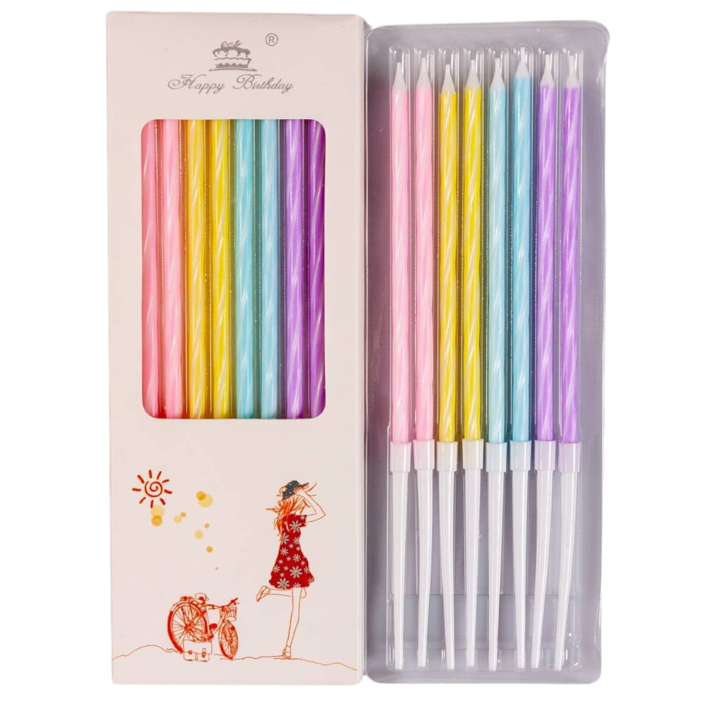 Świeczki urodzinowe we wspaniałych pastelowych kolorach z ciekawym spiralnym wzorem na całej długości. W opakowaniu 8 zjawiskowych świeczek z urodzinowej linii Happy Birthday. To komplet świeczek ze spiralnym wzorem, który nadaje blasku w modnych, pastelowych odcieniach: żółtego, różowego, fioletowego i niebieskiego. Te super modne świeczki będą stanowić nietuzinkową dekorację tortów lub torcików urodzinowych, bento cakes, deserów, zestawów lodowych lub innych słodkości. W eleganckim papierowym opakowaniu miks: 8 kolorowych świeczek wraz z podstawkami.