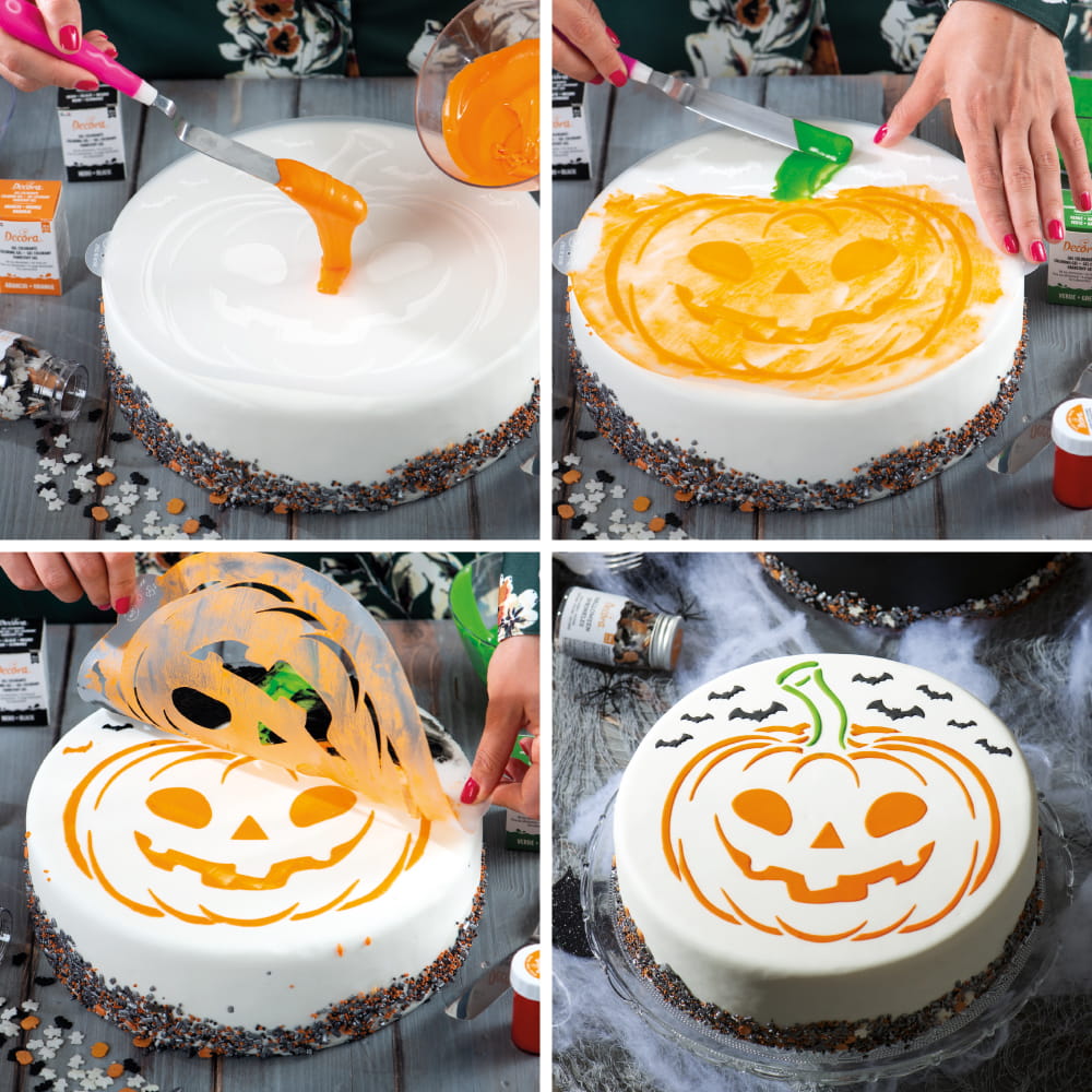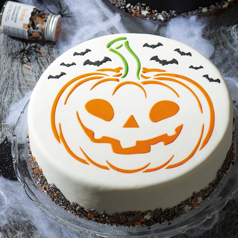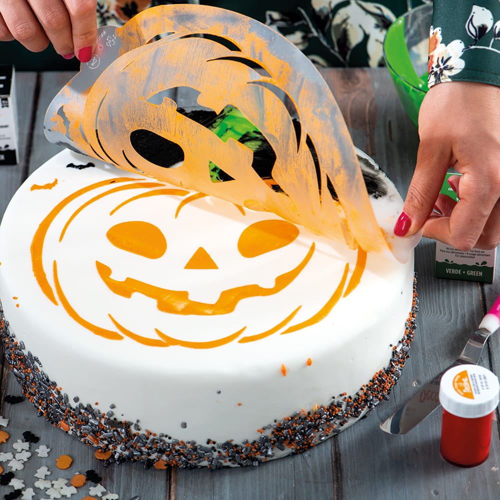Szablon do dekoracji wielokrotnego użycia, wykonany z wysokiej jakości tworzywa. Dopuszczony do kontaktu z żywnością, łatwy do utrzymania w czystości. To idealna pomoc przy dekoracji tortów, wypieków i ciast. Nie wymaga wprawy, ani zaawansowanej wiedzy cukierniczej, żeby stworzyć pięknie wyglądającą dekorację! Pozwoli stworzyć piękny wzór za pomocą lukru królewskiego, kremu maślanego, cukru pudru, kakao, kolorowych sprayów czy aerografu. Wystarczy umieścić szablon na cieście, rozprowadzić krem lub lukier za pomocą szpatułki albo rozsypać barwik czy kakao, spryskać sprayem, pomalować barwnikiem, a na koniec zdjąć szablon i gotowe! Pozwala stworzyć wspaniałą Halloweenową dynię!