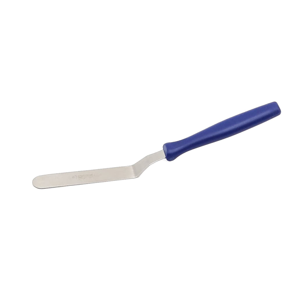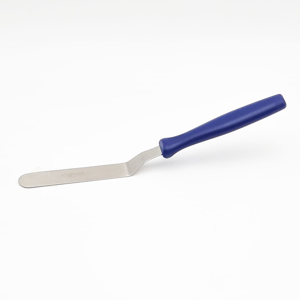 Szpatułka kątowa z ostrzem ze stali nierdzewnej i nieostrymi, zaokrąglonymi brzegami. Najwyższej jakości profesjonalne narzędzie cukiernicze niemieckiej marki Thermohauser. Przeznaczona do rozprowadzania kremów, polewy, lukru i czekolady podczas przygotowania ciast, babeczek i tortów. Dzięki wygiętemu kształtowi ostrza doskonale sprawdza się podczas rozprowadzania masy w formie do pieczenia lub rancie do tortu. Świetna do wygładzania masy na torcie i rozprowadzania kremów na wszystkich jego warstwach. Pozwala szybko i sprawnie napełniać rękawy cukiernicze. Rękojeść wykonana z niebieskiego tworzywa sztucznego z chropowatą powłoką zapewniającą pewny uchwyt.