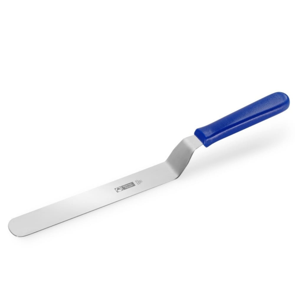 Szpatułka kątowa z ostrzem ze stali nierdzewnej i nieostrymi, zaokrąglonymi brzegami. Najwyższej jakości profesjonalne narzędzie cukiernicze niemieckiej marki Thermohauser. Przeznaczona do rozprowadzania kremów, polewy, lukru i czekolady podczas przygotowania ciast, babeczek i tortów. Dzięki wygiętemu kształtowi ostrza doskonale sprawdza się podczas rozprowadzania masy w formie do pieczenia lub rancie do tortu. Świetna do wygładzania masy na torcie i rozprowadzania kremów na wszystkich jego warstwach. Pozwala szybko i sprawnie napełniać rękawy cukiernicze. Rękojeść wykonana z niebieskiego tworzywa sztucznego z chropowatą powłoką zapewniającą pewny uchwyt.