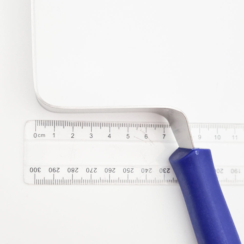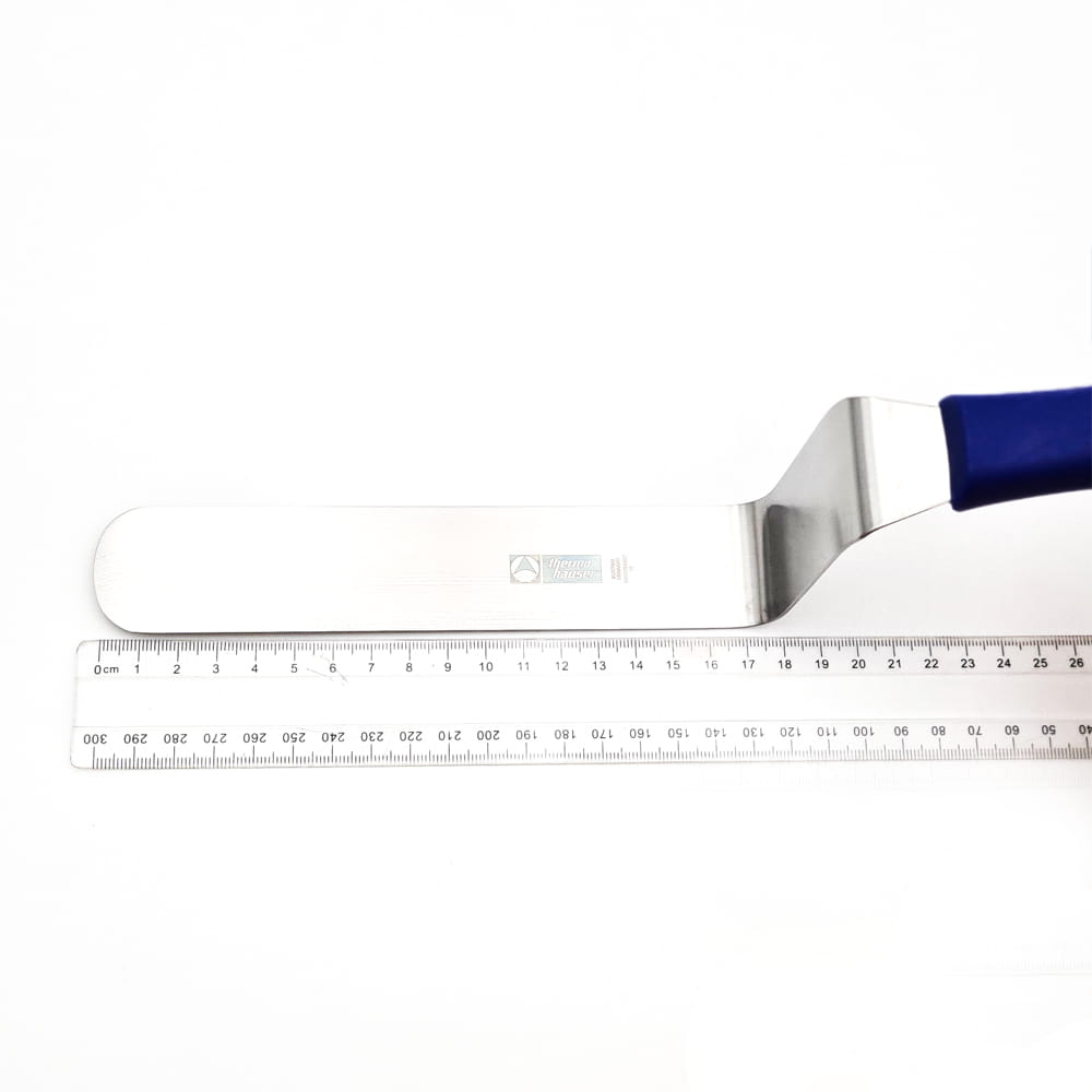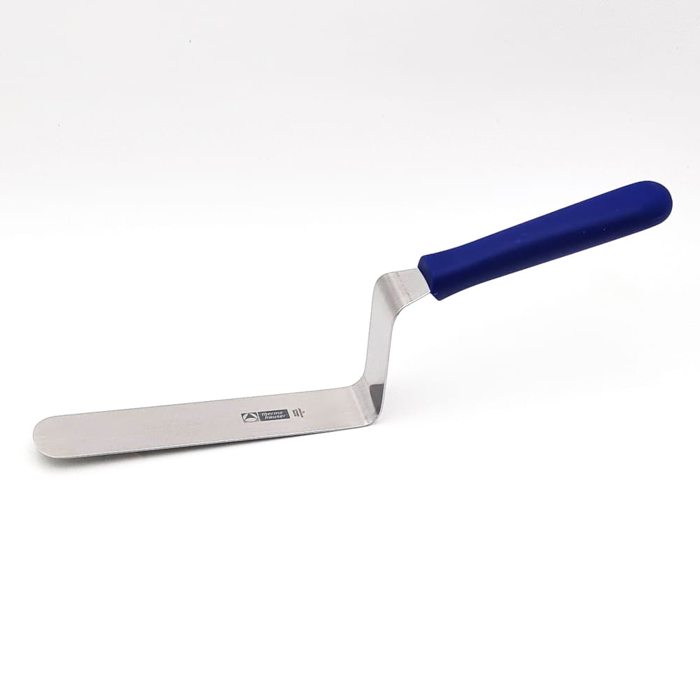 Szpatułka do rantów z ostrzem ze stali nierdzewnej i nieostrymi, zaokrąglonymi brzegami. Najwyższej jakości profesjonalne narzędzie cukiernicze niemieckiej marki Thermohauser. Przeznaczona do rozprowadzania i wygładzania mas, kremów i polew podczas składania tortu w rancie. Wygięta forma pozwala łatwo dotrzeć do trudno dostępnych miejsc. Specjalnie jest tak wyprofilowana, żeby można było łatwo od góry rozsmarować krem w rancie lub formie. Rękojeść wykonana z niebieskiego tworzywa sztucznego z chropowatą powłoką zapewniającą pewny uchwyt.