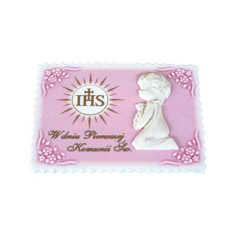 Tabliczka komunijna w formie pięknego wypukłego reliefu, z modlącą się dziewczynką i nadrukiem hostii. Napis "W dniu Pierwszej Komunii Św." zrobiony złotą kursywą. Prostokątna z karbowanymi brzegami. Utrzymana w różowej kolorystyce tła. To piękna duża ozdoba cukrowa o długości 13 cm. Nadaje się do spożycia i została wykonana z bezpiecznych składników i barwników. Może stanowić motyw przewodni większej kompozycji lub pojedynczą dekorację. Idealnie współgra z bielą i złotem komunijnych stołów, dedykowana do uroczystości dla dziewczynek.