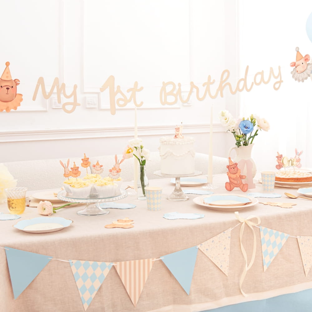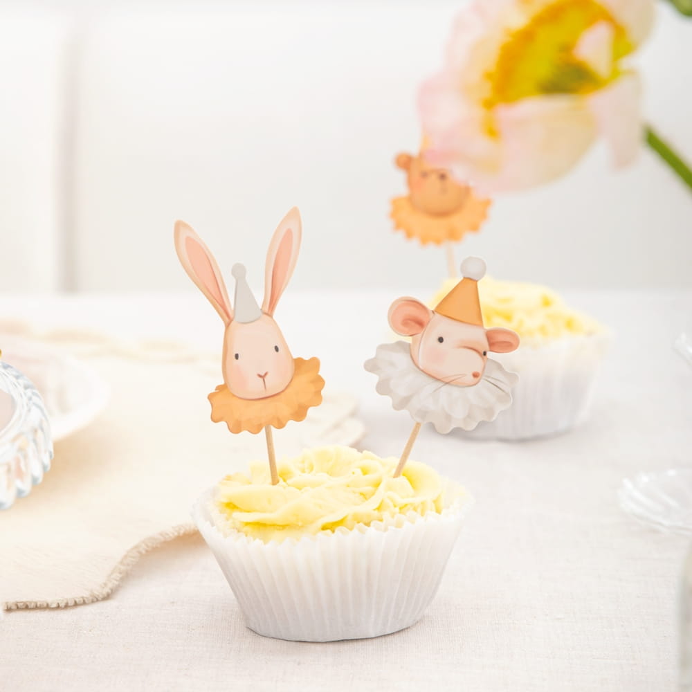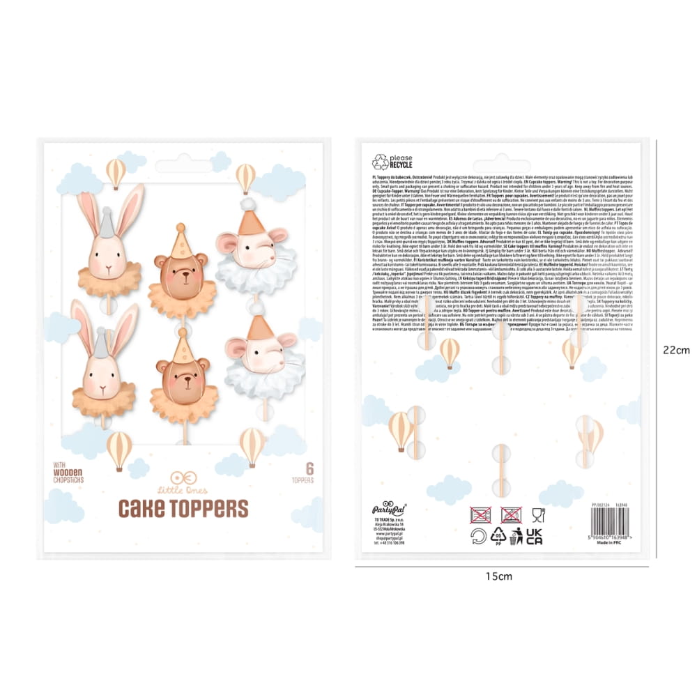 Toppery na tort lub babeczki z uroczymi, ilustrowanymi zwierzątkami w cyrkowych strojach. To zestaw 6 papierowych pikerów z drewnianymi patyczkami do wbijania. W zestawie: dwa misie, dwa króliczki i dwie myszki. Wymiary topperów to 5 - 7 cm, a wysokość z patyczkiem około 10 cm. Utrzymany w ciepłej pastelowej kolorystyce i delikatnym akwarelowym stylu zestaw, pozwala w łatwy sposób udekorować urodzinowy tort, babeczki, muffinki, ciasto, słodki stół czy kinder party. Toppery są szybkie i proste w użyciu, dopuszczone do kontaktu z żywnością i przede wszystkim trwałe, będą wyglądać pięknie przez cały czas trwania nawet najdłuższej uroczystości. Uniwersalna modna kolorystyka pasująca zarówno dla chłopców, jak i dziewczynek.