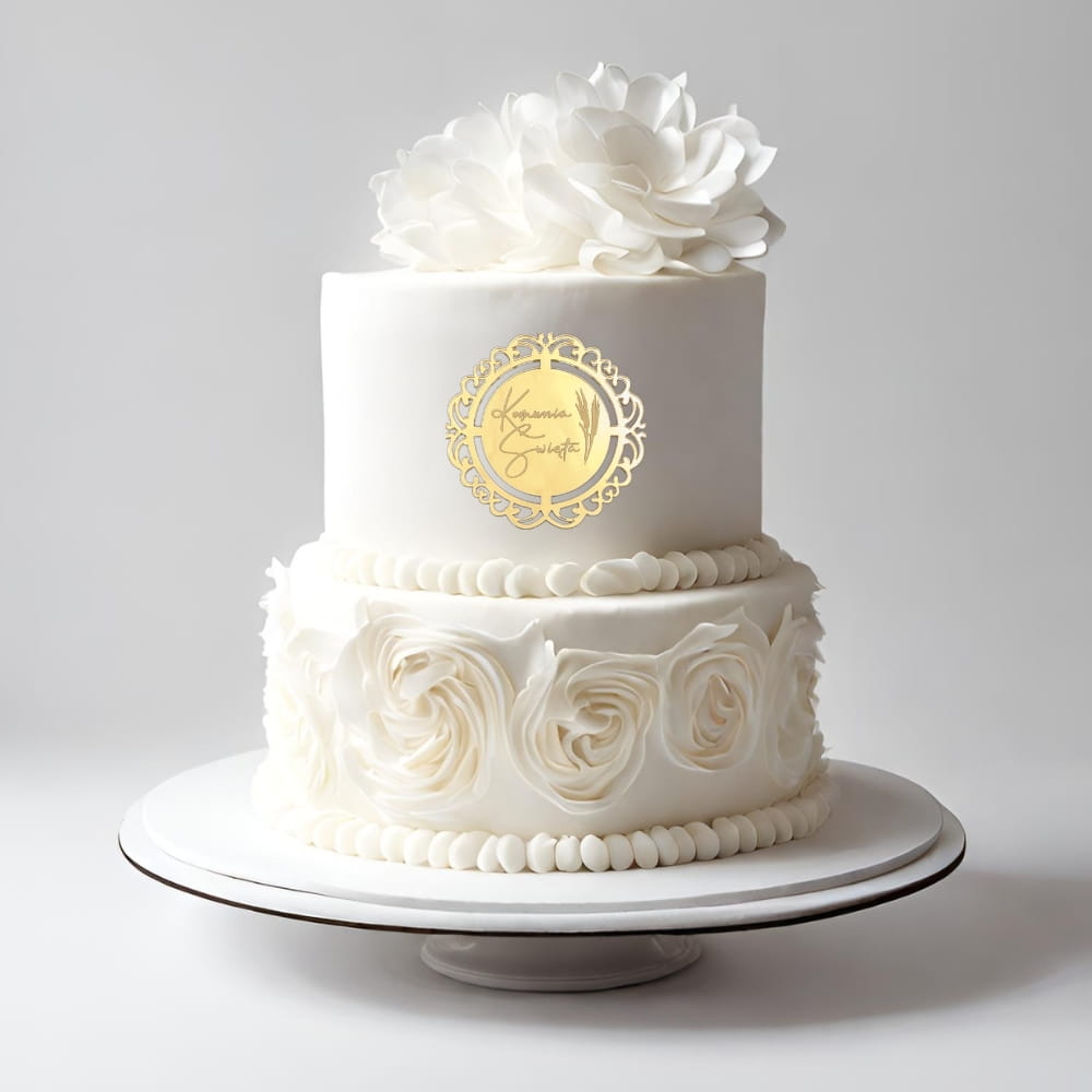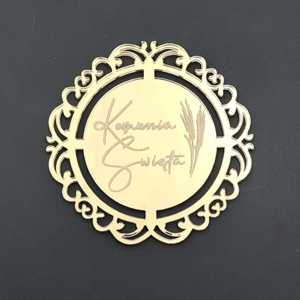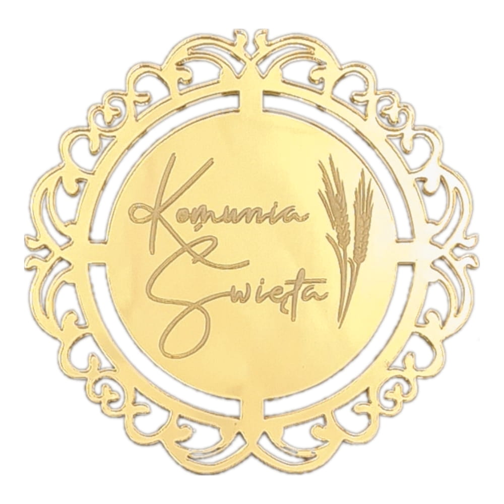 Topper na tort komunijny wykonany z bezpiecznego i dopuszczonego do kontaktu z żywnością pleksi. Materiał jest bardzo mocny i wytrzymały. Piękny artystyczny wzór: złota hostia z wygrawerowanym kłosem zboża i kursywnym napisem: "Komunia Święta". Piękna ozdoba na tort w złotym kolorze z efektownym, lustrzanym odblaskiem. To idealna dekoracja komunijna: w łatwy i efektywny sposób pozwala udekorować bok tortu. I pięknie prezentuje się na zdjęciach! Dekor może też stanowić miłą i trwałą pamiątkę tej wyjątkowej uroczystości.