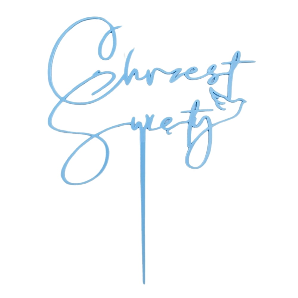 Topper na tort wykonany z bezpiecznego i dopuszczonego do kontaktu z żywnością pleksi. udowny odcień błękitu - baby blue. Materiał jest bardzo mocny i wytrzymały. Wykonany piękną kursywą napis "Chrzest Święty" z konturem małego gołąbka na końcu. Ozdobne zawijasy dużych liter mocno przykuwają uwagę. To piękna błękitna dekoracja niejadalna o matowym wykończeniu. Pozwala bardzo łatwo i szybko udekorować każdy rodzaj tortu. Co więcej, wykonany z plexi topper będzie wyglądał pięknie przez cały czas trwania nawet najdłuższej uroczystości. Może też stanowić miłą i trwałą pamiątkę chrztu.