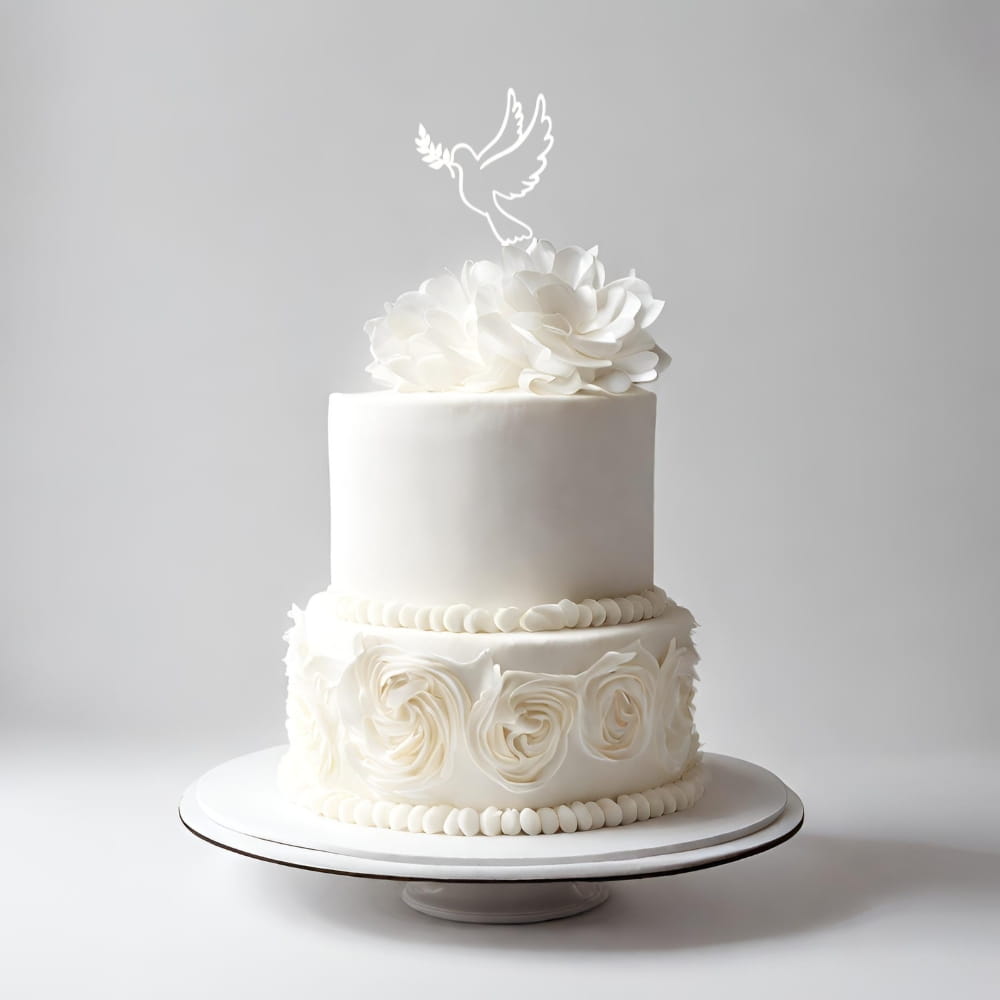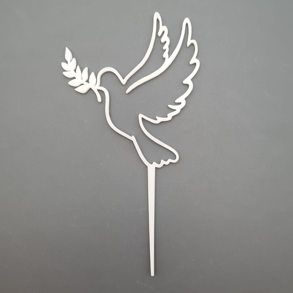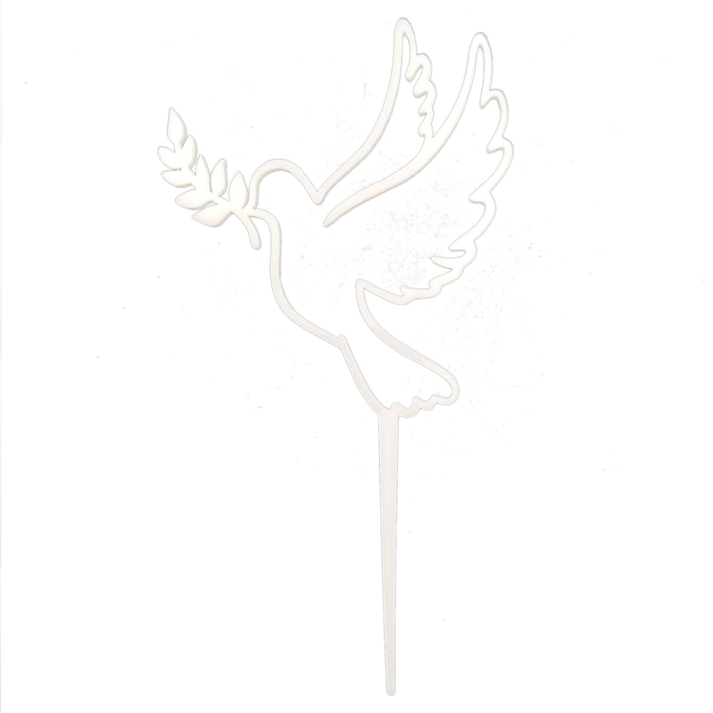 Topper na tort wykonany z bezpiecznego i dopuszczonego do kontaktu z żywnością pleksi. Materiał jest bardzo mocny i wytrzymały. Delikatny zarys białego gołąbka, gołębicy z gałązką oliwną. Piękny symbol Ducha Świętego doskonały do podkreślenia dekoracji z okazji chrztu. To piękna biała dekoracja niejadalna o matowym wykończeniu. Pozwala bardzo łatwo i szybko udekorować każdy rodzaj tortu. Co więcej, wykonany z plexi topper będzie wyglądał pięknie przez cały czas trwania nawet najdłuższej uroczystości. Może też stanowić miłą i trwałą pamiątkę chrztu.
