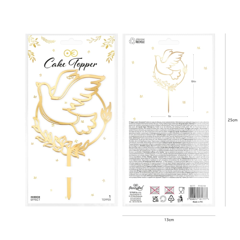 Topper na tort komunijny wykonany z bezpiecznego i dopuszczonego do kontaktu plastiku. Materiał jest bardzo mocny i wytrzymały. Złoty lecący gołąbek w roślinnej obręczy to lekki i cudowny symbol Pierwszej Komunii Świętej. Piękna ozdoba na tort w złotym kolorze z efektownym, lustrzanym odblaskiem. To idealna dekoracja komunijna: w łatwy sposób pozwala udekorować każdy rodzaj tortu lub bukiet na komunijnym stole. Będzie wyglądał pięknie przez cały czas trwania nawet najdłuższej uroczystości. Może też stanowić miłą i trwałą pamiątkę tej wyjątkowej uroczystości.