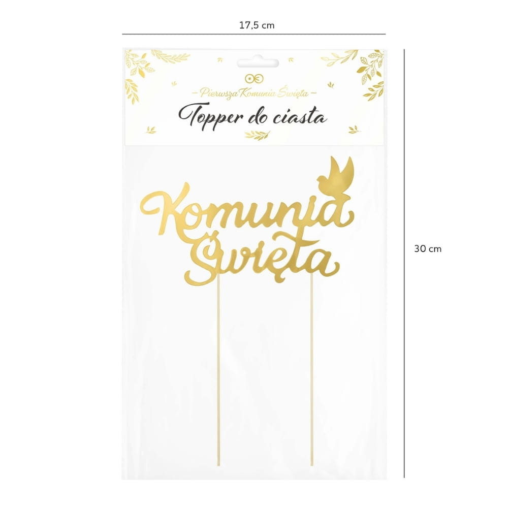 Topper na tort komunijny jednostronny, złoty z dwoma patyczkami, "nóżkami" dla bezpiecznego umieszczenia na torcie. Wyraźny, artystyczny złoty napis: "Komunia Święta" z małym gołąbkiem wznoszącym się do lotu, umieszczonym nad literą "a". Szerokość 16 cm, wysokość 22,5 cm. To idealna dekoracja komunijna: w łatwy sposób pozwala udekorować każdy rodzaj tortu lub bukiet na komunijnym stole. Będzie wyglądał pięknie przez cały czas trwania nawet najdłuższej uroczystości. Może też stanowić miłą i trwałą pamiątkę tej wyjątkowej uroczystości. Dopuszczony do kontaktu z żywnością.