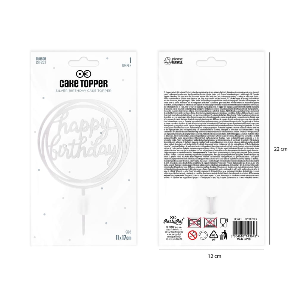 Topper na tort urodzinowy wykonany z bezpiecznego i dopuszczonego do kontaktu z żywnością akrylu. Wykonany miękką kursywą napis "Happy Birthday" stał się jednym z najsilniejszych symboli urodzinowych. Ozdobna, srebrna obręcz, imitująca zakreślenie markerem dodatkowo przykuwa uwagę i dopełnia dekorację. To piękna ozdoba na tort w srebrnym kolorze z efektownym, lustrzanym odblaskiem. Pozwala bardzo łatwo i szybko udekorować każdy rodzaj tortu. Co więcej, wykonany z tworzywa topper będzie wyglądał pięknie przez cały czas trwania nawet najdłuższej uroczystości. Idealny, klasyczny pomysł na urodziny!