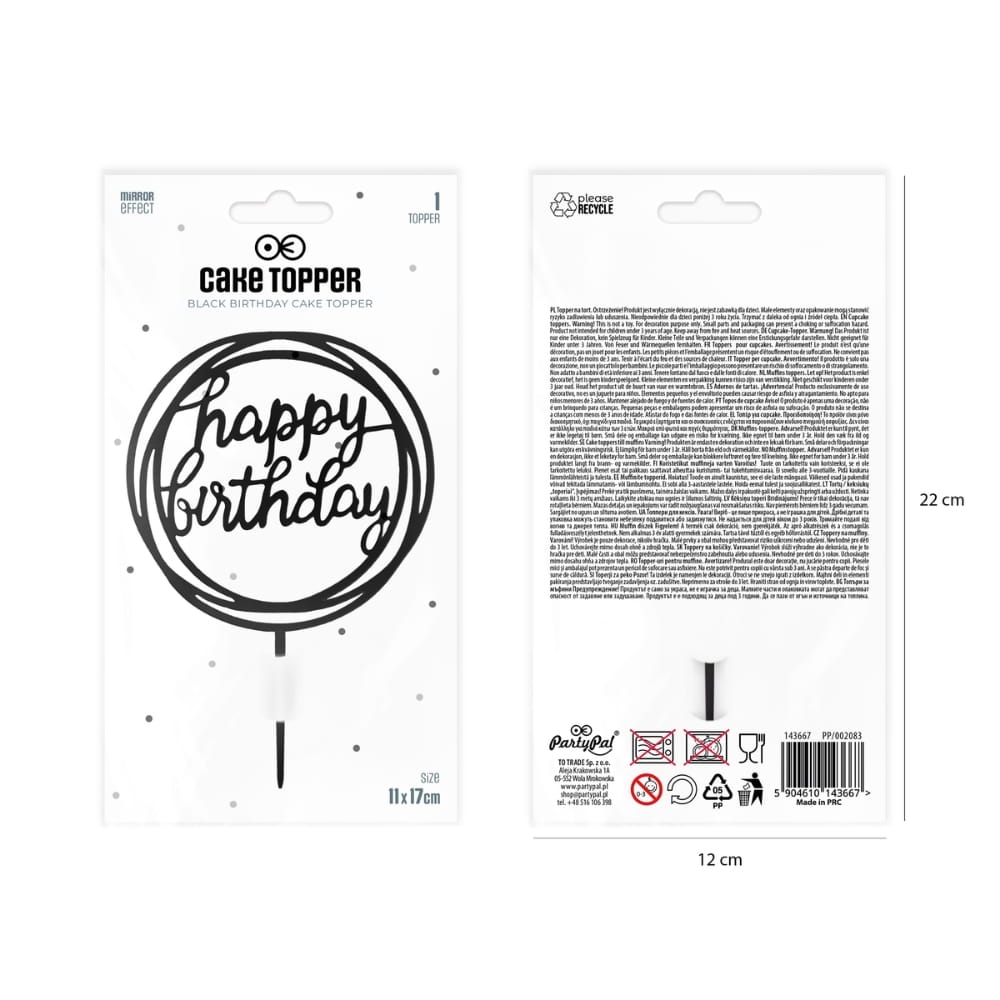 Topper na tort urodzinowy wykonany z bezpiecznego i dopuszczonego do kontaktu z żywnością akrylu. Wykonany miękką kursywą napis "Happy Birthday" stał się jednym z najsilniejszych symboli urodzinowych. Ozdobna czarna obręcz, imitująca zakreślenie markerem dodatkowo przykuwa uwagę i dopełnia dekorację. To piękna ozdoba na tort w czarnym, wyrazistym kolorze. Pozwala bardzo łatwo i szybko udekorować każdy rodzaj tortu. Co więcej, wykonany z tworzywa topper będzie wyglądał pięknie przez cały czas trwania nawet najdłuższej uroczystości. Idealny, klasyczny pomysł na urodziny!