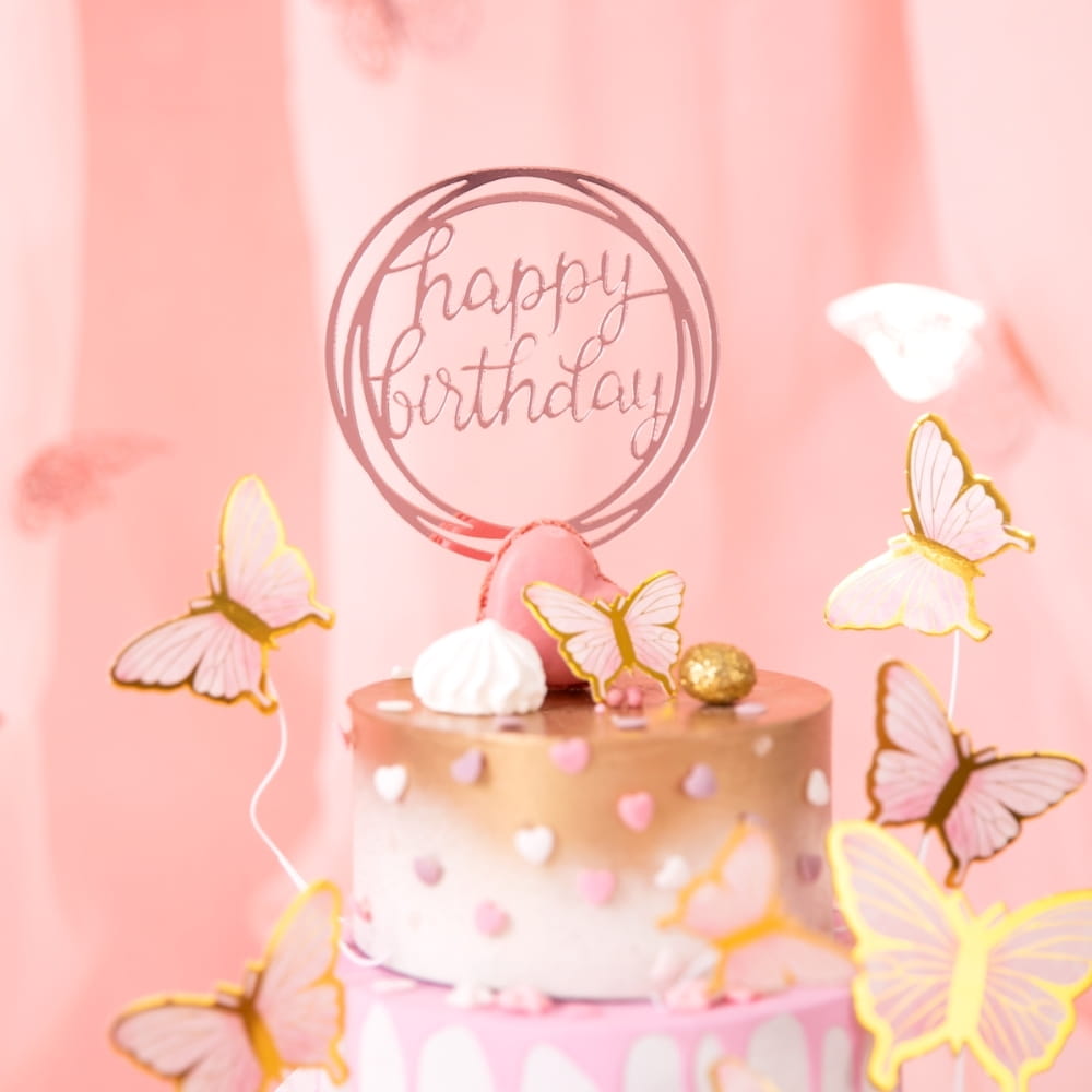 Topper na tort urodzinowy wykonany z bezpiecznego i dopuszczonego do kontaktu z żywnością akrylu. Wykonany miękką kursywą napis "Happy Birthday" stał się jednym z najsilniejszych symboli urodzinowych. Ozdobna, lśniąca różowym złotem obręcz, imitująca zakreślenie markerem dodatkowo przykuwa uwagę i dopełnia dekorację. To piękna ozdoba na tort w kolorze rose gold z efektownym, lustrzanym odblaskiem. Pozwala bardzo łatwo i szybko udekorować każdy rodzaj tortu. Co więcej, wykonany z tworzywa topper będzie wyglądał pięknie przez cały czas trwania nawet najdłuższej uroczystości. Idealny, klasyczny pomysł na urodziny!