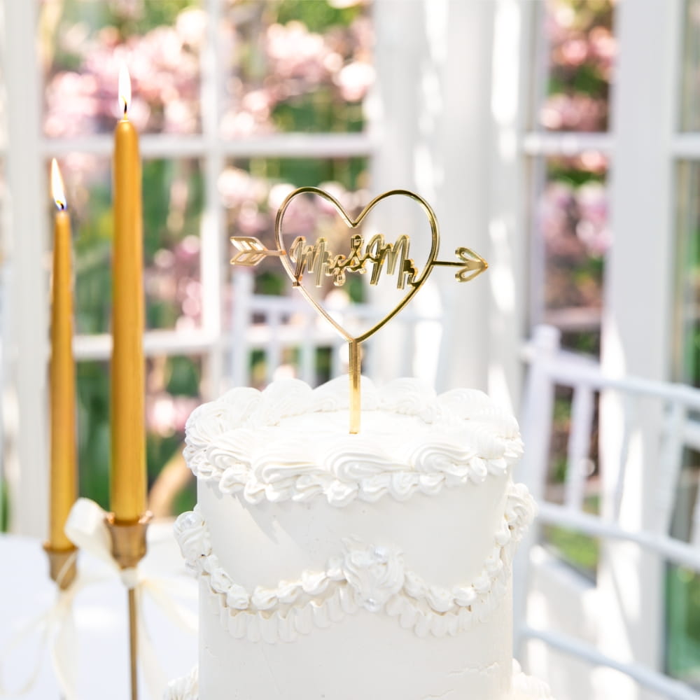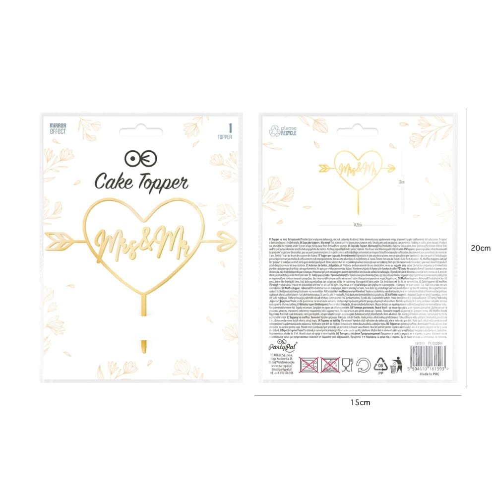 Topper na tort ślubny wykonany z bezpiecznego i dopuszczonego do kontaktu plastiku. Materiał jest bardzo mocny i wytrzymały. Wykonany piękną kursywą napis "Mr&Mrs" w ślicznym stylizowanym sercu ze strzałą stał się jednym z najsilniejszych symboli weselnych. Kształt serca przebitego strzałą mocno przykuwa uwagę. To piękna złota dekoracja niejadalna o lśniącym, lustrzanym wykończeniu. Pozwala bardzo łatwo i szybko udekorować każdy rodzaj tortu. Co więcej, wykonany z tworzywa będzie wyglądał pięknie przez cały czas trwania nawet najdłuższej uroczystości. Idealny, klasyczny pomysł na tort weselny lub zaręczynowy!