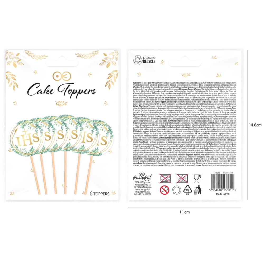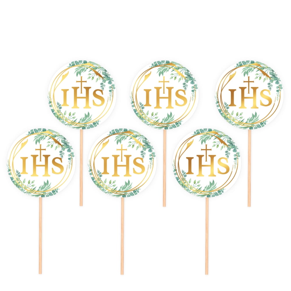 Toppery na tort utrzymane w złoto-białej, komunijnej kolorystyce, dodatkowo ozdobione motywem roślinnym: zielonymi gałązkami. W zestawie 6 sztuk o średnicy 4,5 cm. Na każdym pikerze złoty napis IHS z krzyżykiem i złot-zieloną obwódką z gałązkami na białym tle. Papierowe toppery są jednostronne. Ten prosty design to klasyka, która sprawdzi się na każdym stole. Pozwala w łatwy sposób udekorować każdy rodzaj komunijnego tortu, babeczki, ciasta, wypieki lub bukiet na komunijnym stole. Toppery są szybkie i proste w użyciu, dopuszczone do kontaktu z żywnością i przede wszystkim trwałe, będą wyglądać pięknie przez cały czas trwania nawet najdłuższej uroczystości.