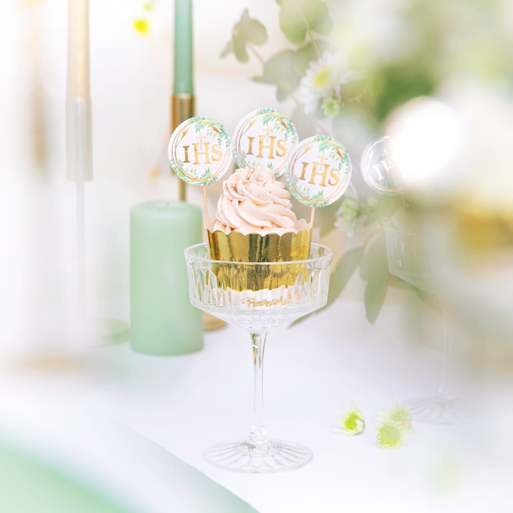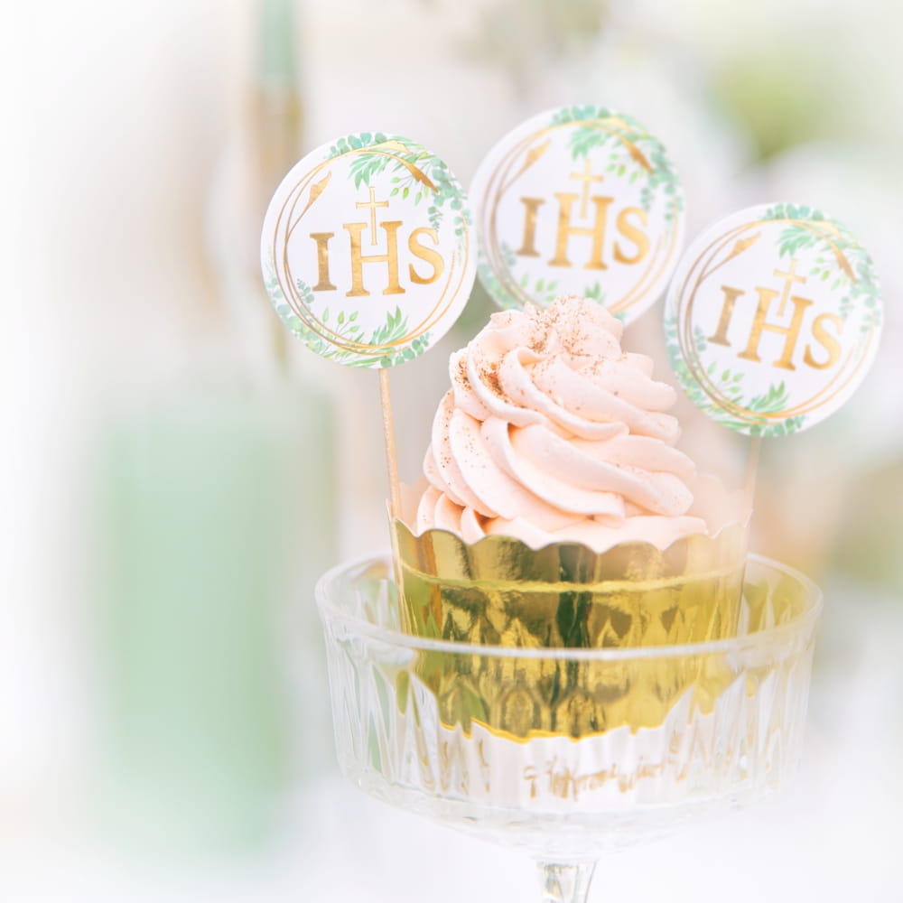 Toppery na babeczki komunijne Złoty IHS z gałązką 6szt