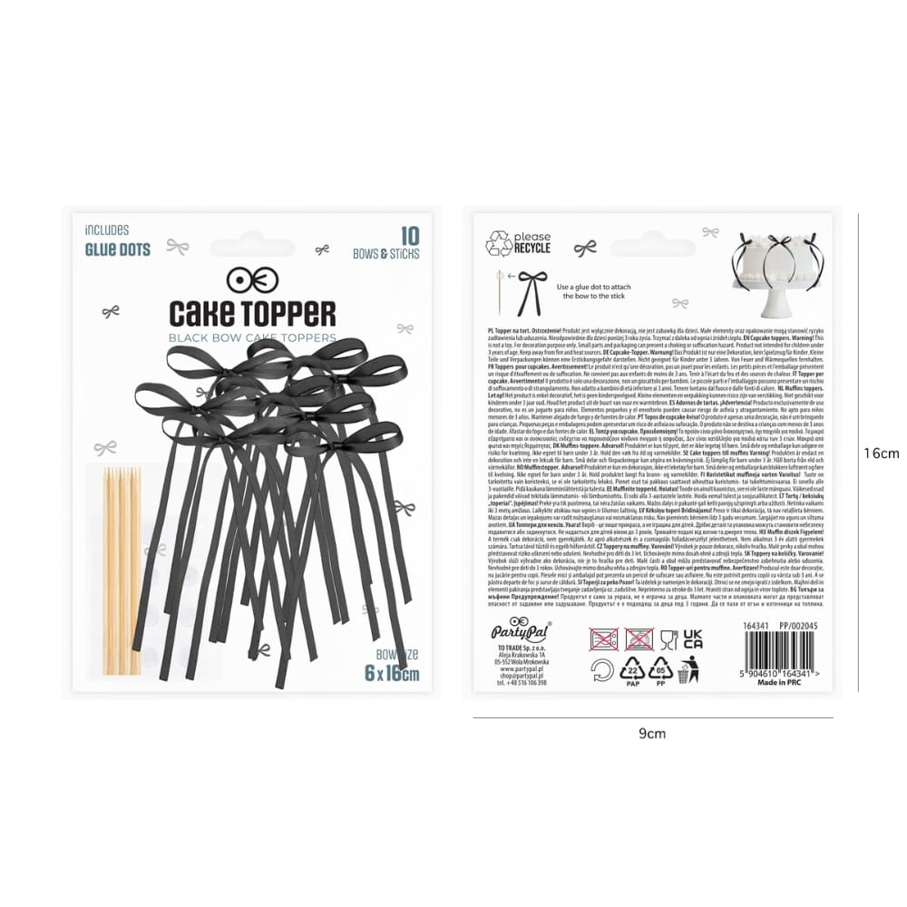 Topper na tort w postaci pięknej, czarnej kokardki z drewnianym patyczkiem do wbicia w tort. Super modny topper do dekoracji wyjątkowych dzieł cukierniczych. Kokardki i patyczki są osobno, przed użyciem należy każdą z kokardek przykleić do patyczków za pomocą dołączonego do zestawu kleju w płatkach. Delikatna wstążka zawiązana w kokardkę ma elegancki czarny kolor i zwiewną formę. Ta uniwersalna ozdoba pasuje do każdego typu tortu, ciasta i uroczystości, ale najlepiej się sprawdzi w przypadku wyjątkowych tortów weselnych, komunijnych i piętrowych tortów urodzinowych. Szybka i prosta w użyciu, dopuszczona do kontaktu z żywnością.