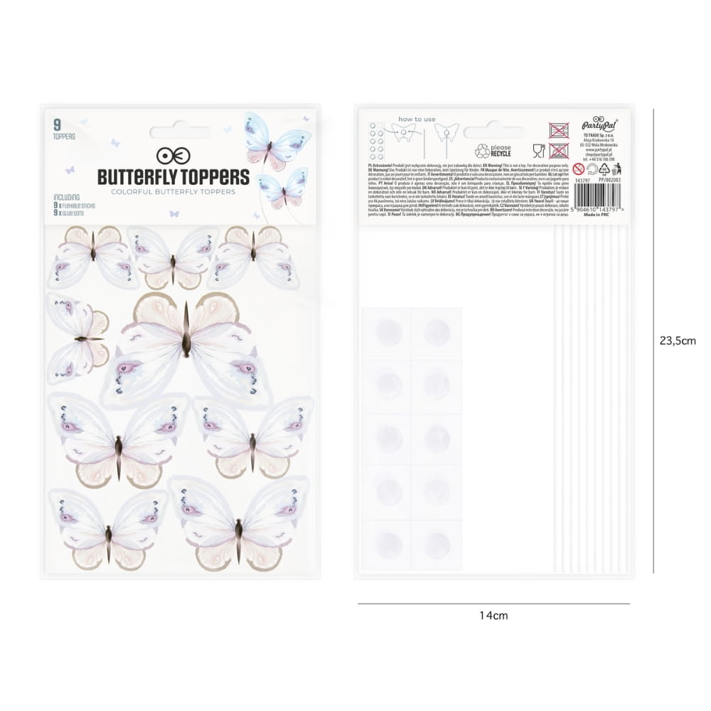 - W zestawie: 9 szt. papierowych motylków różnej wielkości, 9 szt. elastycznych pikerów, 10 szt. kropek klejowych