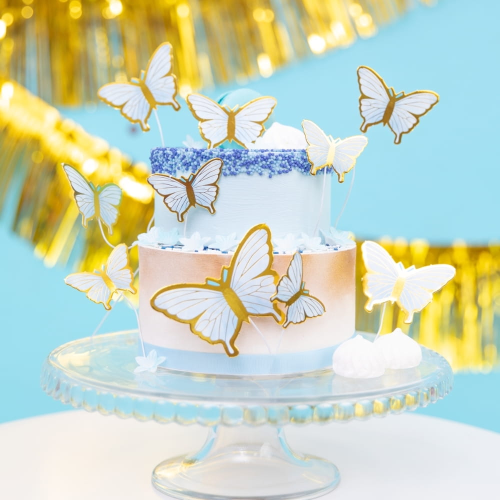 Topper na tort w postaci pięknych papierowych motyli z elastycznym pikerem do wbicia w tort. Zestaw 9 niebiesko-złotych motyli w różnych rozmiarach: o szerokości od 5 cm do 8,8 cm. Wygląd tych dwukolorowych motyli topperów jest niepowtarzalny, idealny do dekoracji wyjątkowych dzieł cukierniczych. Motyle i pikery są osobno, przed użyciem należy każdego z motylków przykleić do pikerów za pomocą dołączonych do zestawu kropek klejowych. Elastyczność drucików do mocowania daje pełną kontrolę nad kompozycją. Błękitne motyle mają kolor wytworny niczym oprawiony w złoto klejnot. Ta uniwersalna ozdoba pasuje do każdego typu tortu, ciasta i uroczystości, ale najlepiej się sprawdzi w przypadku wyjątkowych tortów weselnych, komunijnych i piętrowych tortów urodzinowych. Szybka i prosta w użyciu, dopuszczona do kontaktu z żywnością.