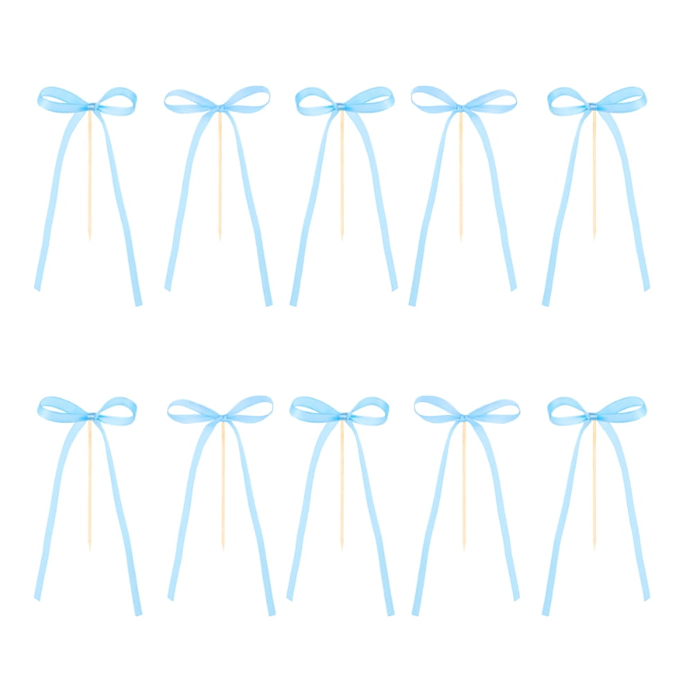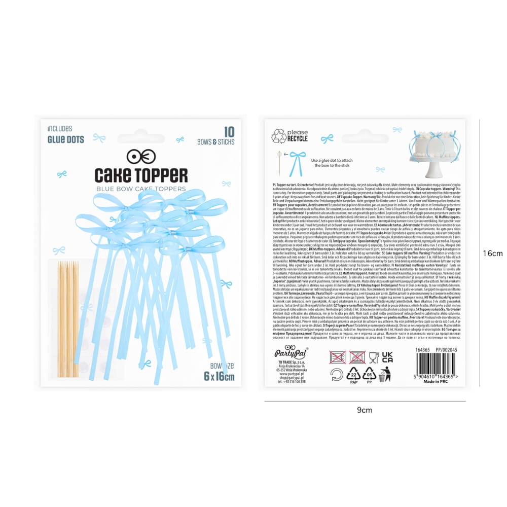 Topper na tort w postaci pięknej, błękitnej kokardki z drewnianym patyczkiem do wbicia w tort. Super modny topper do dekoracji wyjątkowych dzieł cukierniczych. Kokardki i patyczki są osobno, przed użyciem należy każdą z kokardek przykleić do patyczków za pomocą dołączonego do zestawu kleju w płatkach. Delikatna wstążka zawiązana w kokardkę ma prześliczny błękitny, jasnoniebieski kolor i zwiewną formę. Ta uniwersalna ozdoba pasuje do każdego typu tortu, ciasta i uroczystości, ale najlepiej się sprawdzi w przypadku wyjątkowych tortów weselnych, komunijnych i piętrowych tortów urodzinowych. Szybka i prosta w użyciu, dopuszczona do kontaktu z żywnością.