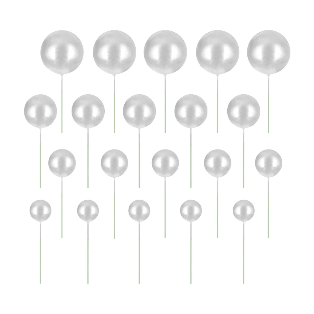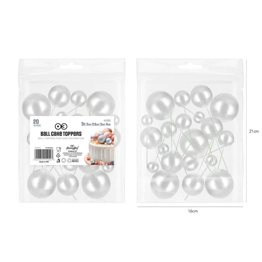 Topper na tort w postaci zestawu pięknych, srebrnych kul różnej wielkości o lekko błyszczącym wykończeniu. W zestawie 4 średnice kul: 2, 2,5, 3 i 4 cm po 5 sztuk dla każdej wielkości. Każda kula jest zaopatrzona w wygodny drut florystyczny do wbicia w tort lub ciasto. Super modny topper do dekoracji wyjątkowych dzieł cukierniczych. Ta uniwersalna ozdoba pasuje do każdego typu tortu, ciasta i uroczystości. Idealnie sprawdzi się przy dekoracji tortów na ślub, walentynki, chrzciny, baby shower, komunię, urodziny, wesele czy wieczór panieński lub kawalerski. Szybka i prosta w użyciu, dopuszczona do kontaktu z żywnością. W opakowaniu 20 sztuk w 4 średnicach.