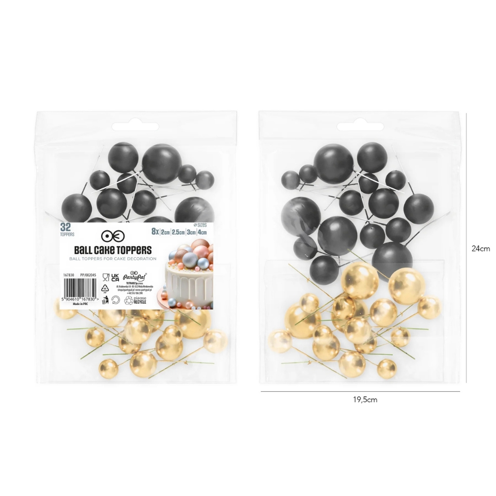 Topper na tort w postaci zestawu pięknych, czarnych i złotych kul różnej wielkości o matowym wykończeniu. W zestawie 4 średnice kul: 2, 2,5, 3 i 4 cm po 8 sztuk dla każdej wielkości, po 4 w każdym kolorze. Każda kula jest zaopatrzona w wygodny drut florystyczny do wbicia w tort lub ciasto. Super modny topper do dekoracji wyjątkowych dzieł cukierniczych. Ta uniwersalna ozdoba pasuje do każdego typu tortu, ciasta i uroczystości. Idealnie sprawdzi się przy dekoracji tortów na ślub, walentynki, chrzciny, baby shower, komunię, urodziny, wesele czy wieczór panieński lub kawalerski. Szybka i prosta w użyciu, dopuszczona do kontaktu z żywnością. W opakowaniu 32 sztuki w 4 średnicach i 2 kolorach.