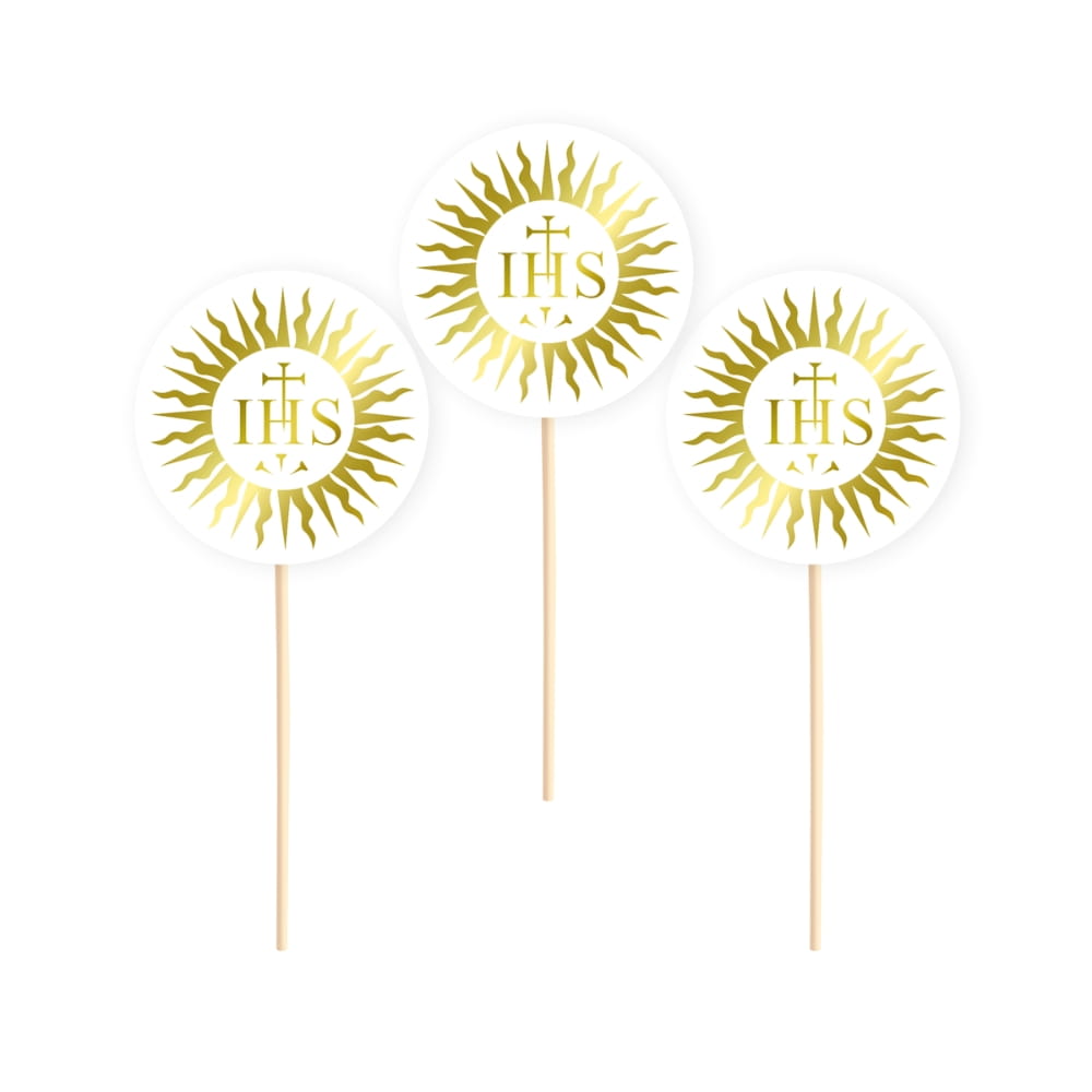 Toppery na tort babeczki komunijne biało-złoty IHS 6szt