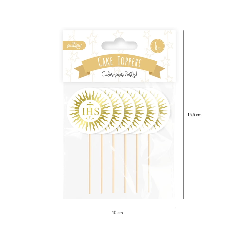 Toppery na tort utrzymane w złoto-białej, komunijnej kolorystyce. W zestawie 6 sztuk o wysokości około 10 cm. Na każdym pikerze złoty napis IHS z krzyżykiem i złotą poświatą. Całość na czysto białym tle. Papierowe toppery są jednostronne. Ten prosty design to klasyka, która sprawdzi się na każdym stole. Pozwala w łatwy sposób udekorować każdy rodzaj komunijnego tortu, babeczki, ciasta, wypieki lub bukiet na komunijnym stole. Toppery są szybkie i proste w użyciu, dopuszczone do kontaktu z żywnością i przede wszystkim trwałe, będą wyglądać pięknie przez cały czas trwania nawet najdłuższej uroczystości.