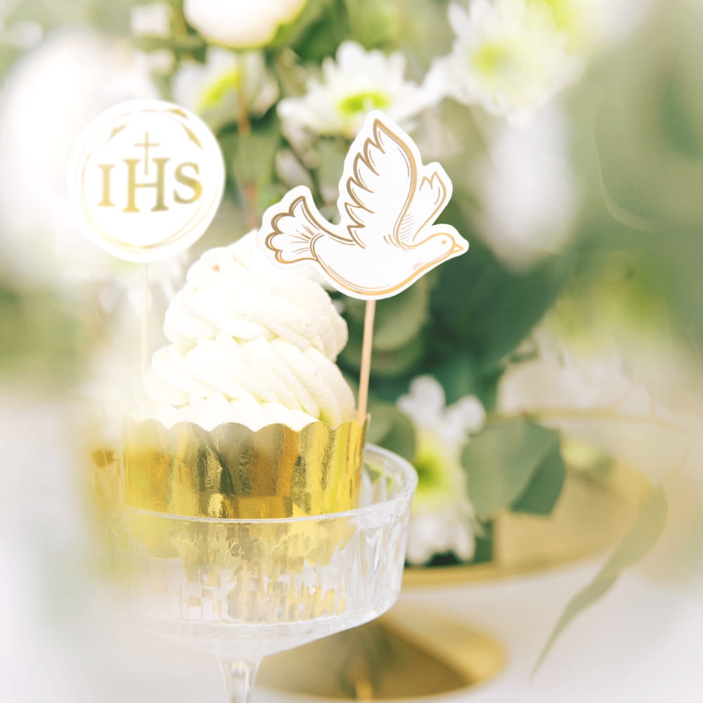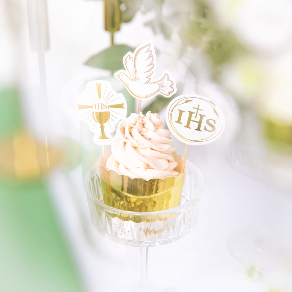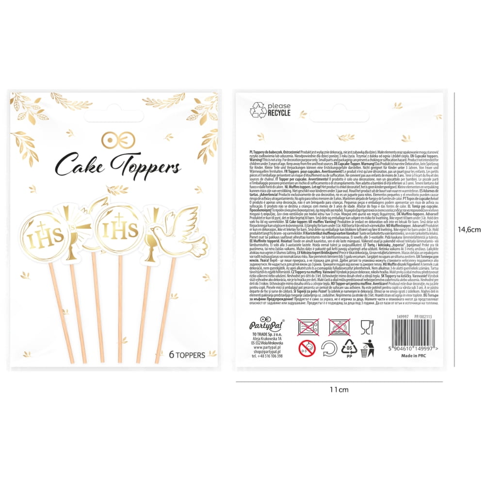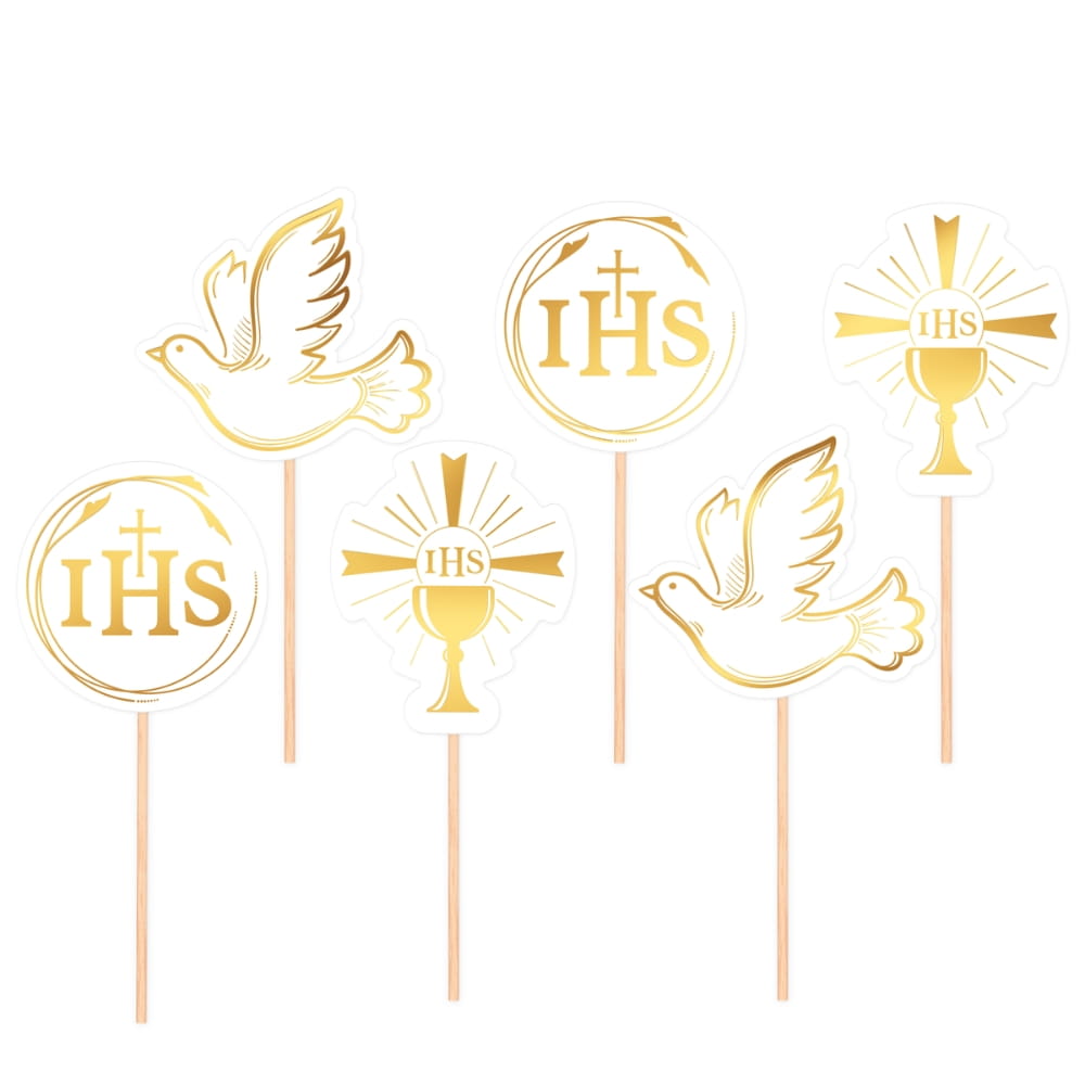 Toppery na tort utrzymane w złoto-białej, komunijnej kolorystyce. W zestawie 6 sztuk: dwa ze złotymi napisami IHS, dwa z gołąbkiem oraz dwa z kielichem i hostią. Ten prosty design to klasyka, która sprawdzi się na każdym stole. To zestaw 6 papierowych pikerów z drewnianymi patyczkami do wbijania o wysokości 13 cm. Utrzymany w modnej kolorystyce zestaw pozwala w łatwy sposób udekorować każdy rodzaj komunijnego tortu, babeczki, ciasta, wypieki lub bukiet na komunijnym stole. Toppery są szybkie i proste w użyciu, dopuszczone do kontaktu z żywnością i przede wszystkim trwałe, będą wyglądać pięknie przez cały czas trwania nawet najdłuższej uroczystości.