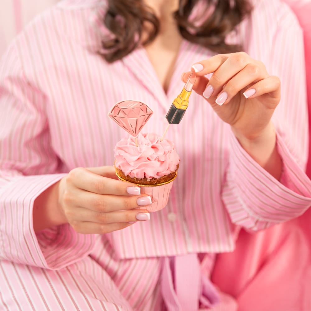 Toppery na tort lub babeczki z motywem wieczoru panieńskiego. To zestaw 6 niepowtarzalnych papierowych pikerów z drewnianymi patyczkami do wbijania. W zestawie: szminka, brylant, serce z napisem, okulary "She said Yes", gorset i usta. Toppery mają 9 - 11 cm wysokości i są jednostronne. Posiadają nadruki z miękkim cieniowaniem, co nadaje im lekkości i elegancji. Utrzymane w pudrowo-różowej kolorystyce z eleganckimi tonami czerni i białymi pociągnięciami. Pozwolą w cudowny i wyjątkowy sposób udekorować dziewczyński słodki stół w stylu „Instagram-friendly”. Sprawdzą się do dekoracji małych form typu finger-food, babeczek, muffinek, monoporcji, deserów w słoiczkach, pączków typu donuts, torcików bento, jak i klasycznych tortów. Toppery są szybkie i proste w użyciu, dopuszczone do kontaktu z żywnością i przede wszystkim trwałe, będą wyglądać pięknie przez cały czas trwania nawet najdłuższej uroczystości. Idealny pomysł na wieczór panieński!