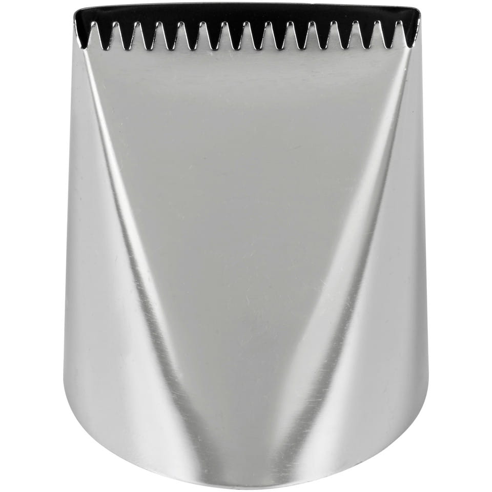 Tylka cukiernicza ze stali nierdzewnej pokrytej stopem niklu i mosiądzu, od renomowanej marki Wilton. Posiada podłużny otwór o jednej krawędzi ząbkowanej a drugije gładkiej. Może być używana ze wszystkim rękawami cukierniczymi. Tylka nie pasuje do adapterów Wilton. Doskonale sprawdzi się do pokrywania wierzchu i boków tortu kremem. Pozwala bardzo szybko udekorować tort i uniknąć irytującego zabrudzenia masy okruszkami ciasta. Po wyciśnięciu masy można bardzo szybko wygładzić powierzchnię szpatułką do kremu.