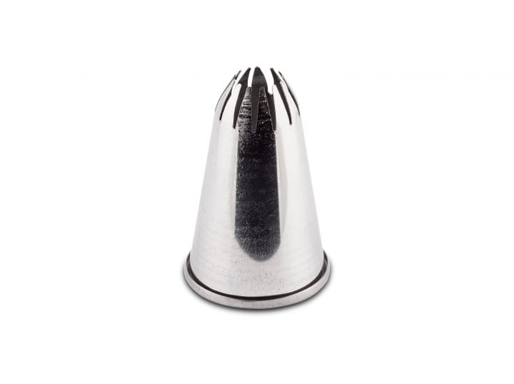 Tylka cukiernicza, czyli metalowa końcówka do dekorowania za pomocą rękawów i worków cukierniczych. Doskonale sprawdzi się do precyzyjnego dekorowania ciasteczek, babeczek, muffinków, tortów, wypieków, deserów czy dań. Ta okrągła tylka posiada średnicę wylotu 18 mm i 13 ząbków tworzących gwiazdę. Może być używana bezpośrednio z każdym rękawem lub workiem cukierniczym. Końcówka z ząbkowanym otworem pozwoli zrobić efektowne róże, gwiazdki, osiągnąć efekt płatków kwiatów czy stworzyć zdobienia w kształcie szlaczków i warkoczy.