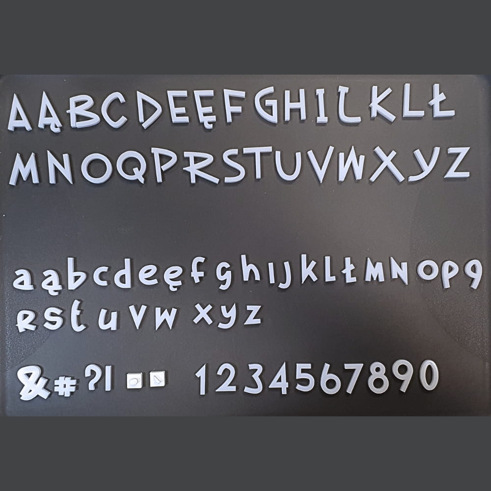 - Zawartość zestawu: małe, duże litery, cyfry, polskie czcionki, znaki specjalne: & # ?