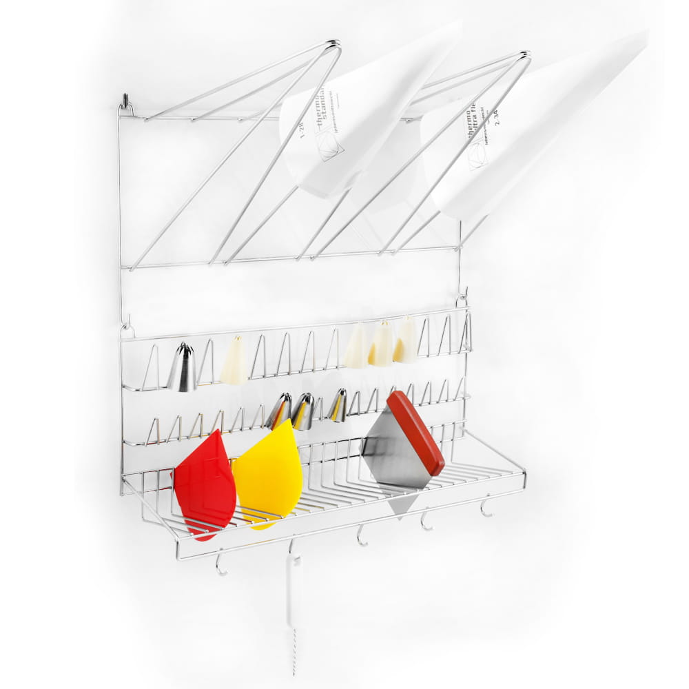 Wieszak na tylki wykonany ze stali nierdzewnej do praktycznego przechowywania rękawów cukierniczych, tylek, końcówek i drobnego sprzętu. Najwyższej jakości, trwały produkt marki Thermohauser.