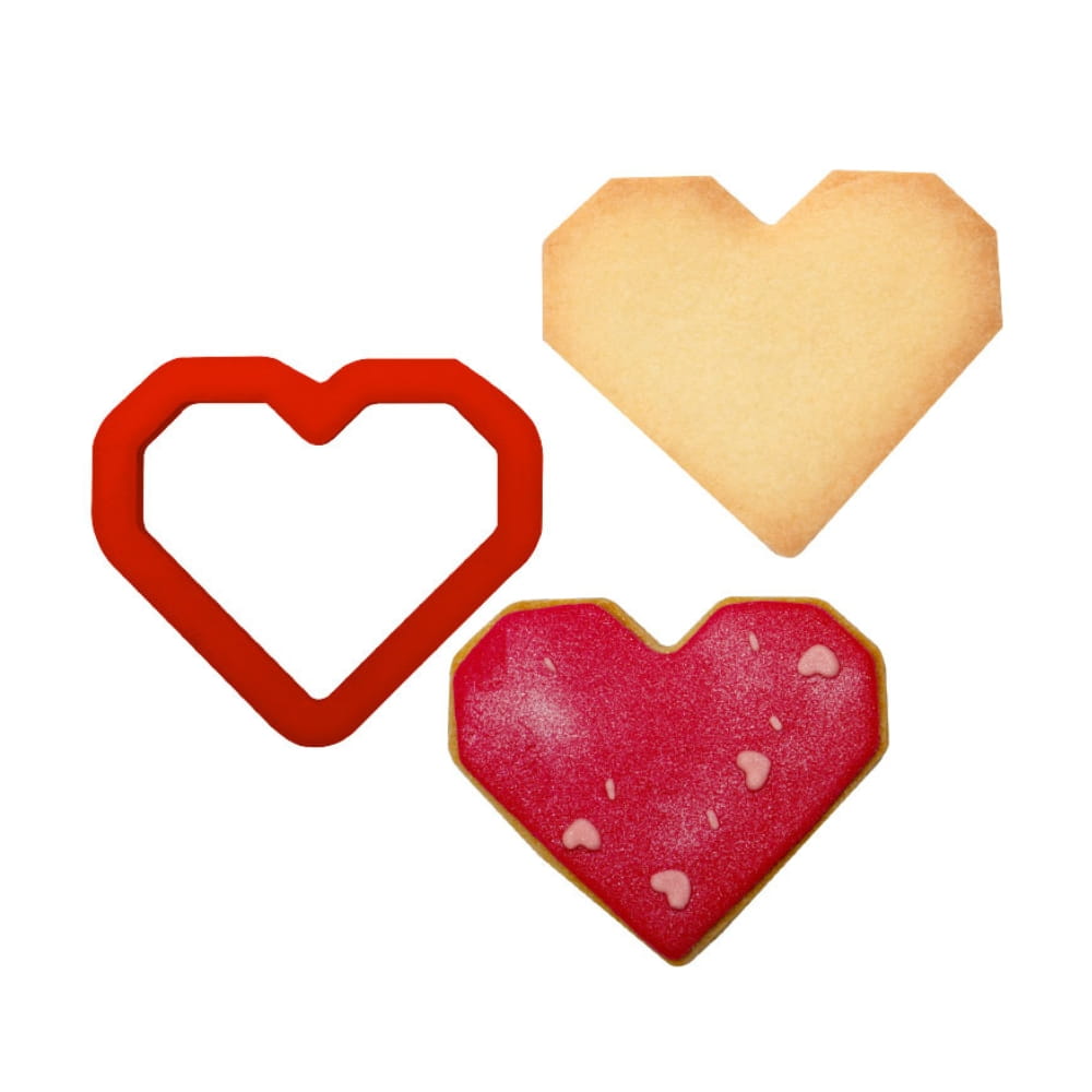 Foremka wykrojnik do wycinania, odciskania kształtu wielkiego geometrycznego serca. Ta duża plastikowa foremka przedstawia stylizowane serce o charakterystycznym "kwadratowym" kształcie. Wymiary wykrojnika to 7 na 5 cm. Foremka ma z jednej strony ostry brzeg, z drugiej bezpieczny, wyprofilowany rant do naciskania. Wykonana z higienicznego i łatwego do utrzymania w czystości tworzywa przystosowanego do kontaktu z żywnością. Jest naprawdę ostra: poradzi sobie nawet ze schłodzona masą cukrową. Wykrojnik pozwala uformować pierniczki, ciasteczka, ozdoby z masy cukrowej, ciastoliny, marcepanu lub czekoladki. Można też tworzyć kolorowe dekoracje z masy cukrowej! Stworzone w ten sposób walentynkowe dekoracje są idealne do malowania, pokrywania, ozdabiania i lukrowania.