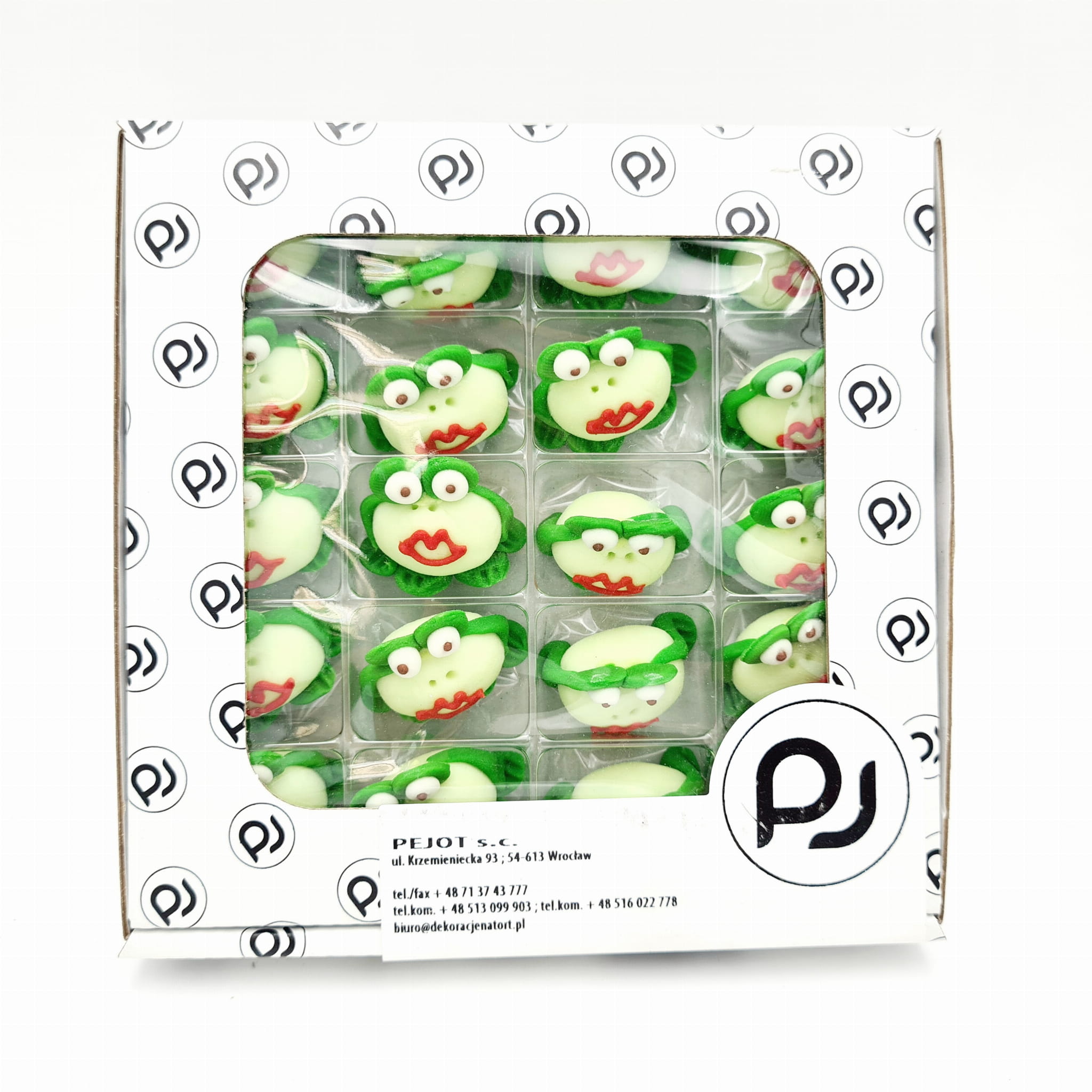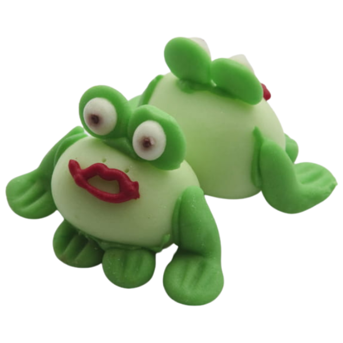 Figurki cukrowe to w pełni jadalne dekoracje wykonane z masy cukrowej. Wesołe figurki przedstawiają zielone, całuśne żabki. Wykonane z masy cukrowej figurki mają wymiary 45 × 30 × 20 mm i wprowadzą ogrom wiosennej radości do dekoracji. Figurki żabek wspaniale sprawdzą się jako dekoracja ciast deserów, muffinek, babeczek, wypieków i wszelkich słodkości. Figurki są jadalne i barwione spożywczymi, bezpiecznymi farbkami. Pozwolą stworzyć cudowne dekoracje i kompozycje cukiernicze. Doskonałe do ozdabiania wypieków i słodkości związanych z bajkami i imprezami dla dzieci. Każda dekoracja jest wykonana ręcznie, a przez to wyjątkowa i niepowtarzalna, dlatego może minimalnie różnić się od tego przedstawionego na zdjęciu. W opakowaniu 20 sztuk.