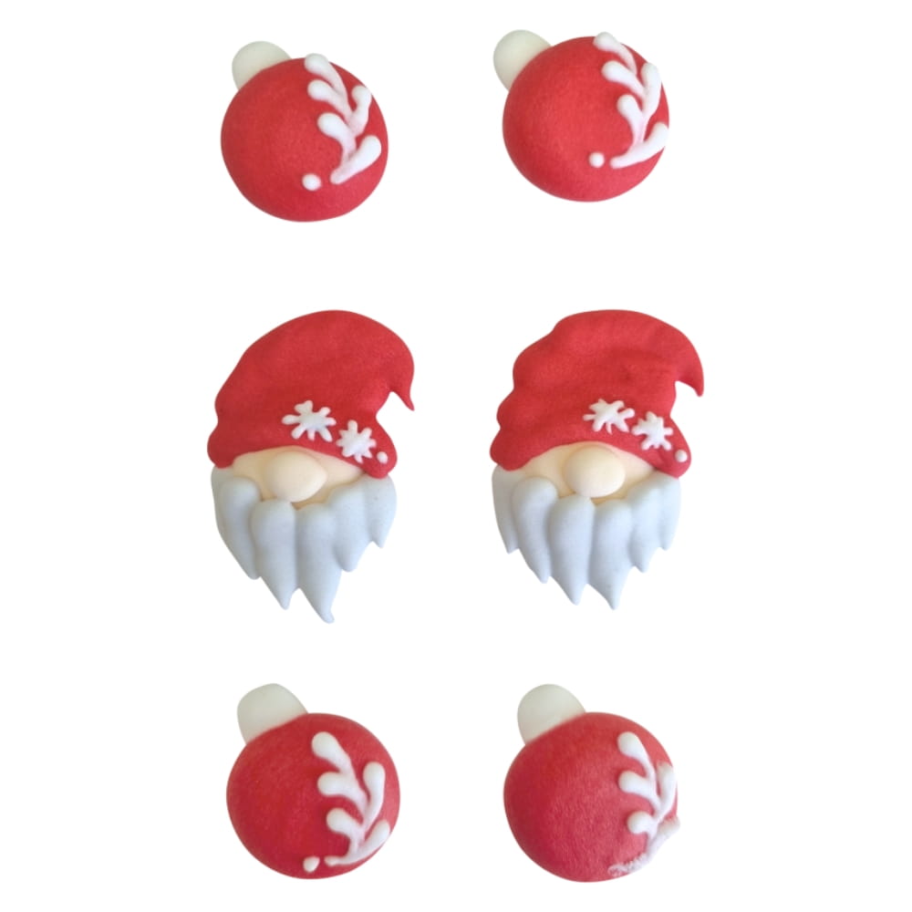 Figurki cukrowe to w pełni jadalne dekoracje wykonane z masy cukrowej. W zestawie dwa wzory: 4 piękne trójwymiarowe bombki i 2 brodate skrzaty. Żywa świąteczna czerwień wspaniale współgra z bielą i skupia uwagę. Bombki mają rozmiar 30 mm a głowy skrzatów 45 mm. Idealne do ozdabiania świątecznych muffinek, babeczek, ciasteczek, deserów, ciast i wypieków. Zabawa z nimi ucieszy nie tylko najmłodszych. Są jadalne i barwione spożywczymi, bezpiecznymi farbkami. Dodadzą uroku i nastroju każdemu bożonarodzeniowemu stołowi! W zestawie 6 sztuk.