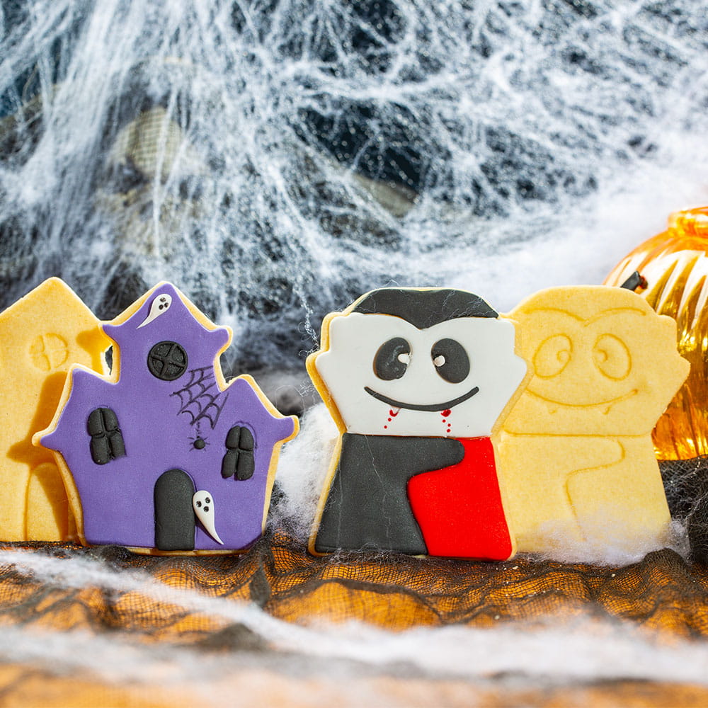 Wykrojniki z wampirem do wycinania, odciskania wspaniałych obrazków o klimacie Halloween. Dwa plastikowe wykrojniki przedstawiają słodkiego wampirka i nawiedzony zamek. Foremki mają z jednej strony ostry brzeg, z drugiej bezpieczny, wyprofilowany rant do naciskania. Wykonane z higienicznego i łatwego do utrzymania w czystości tworzywa przystosowanego do kontaktu z żywnością. Są naprawdę ostre: poradzą sobie nawet ze schłodzona masą cukrową. Zestaw pozwala uformować upiorne ciasteczka, ozdoby z masy cukrowej, ciastoliny, marcepanu, czekoladki lub pierniczki. Można też tworzyć kolorowe dekoracje z masy cukrowej! Stworzone w ten sposób halloweenowe dekoracje są idealne do malowania, pokrywania, ozdabiania i lukrowania.